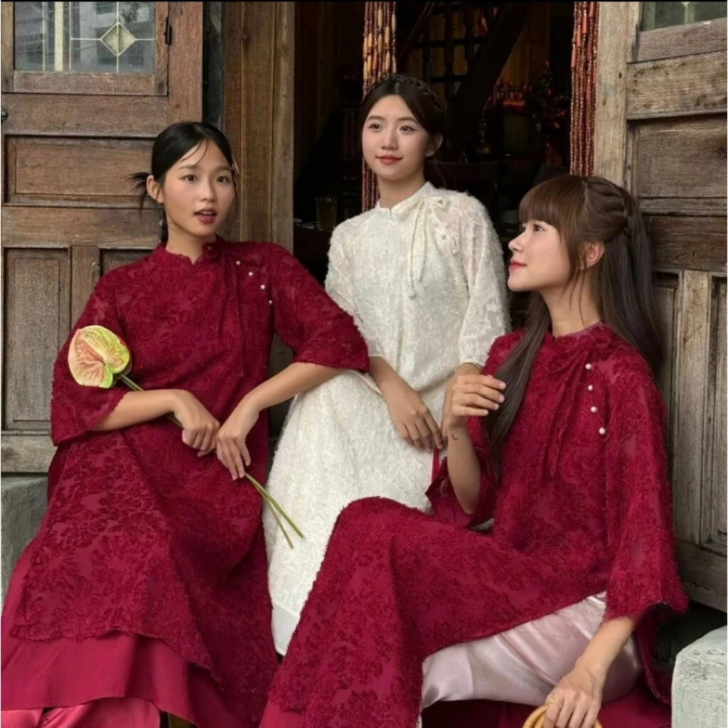 Áo dài lông vũ ForgirlStudio áo dài đỏ hiện đại mẫu mới chất ren 2 lớp tay lỡ cổ trụ cột nơ phối quần lụa T031
