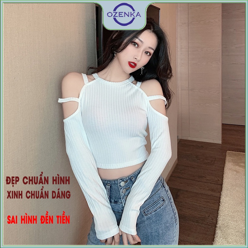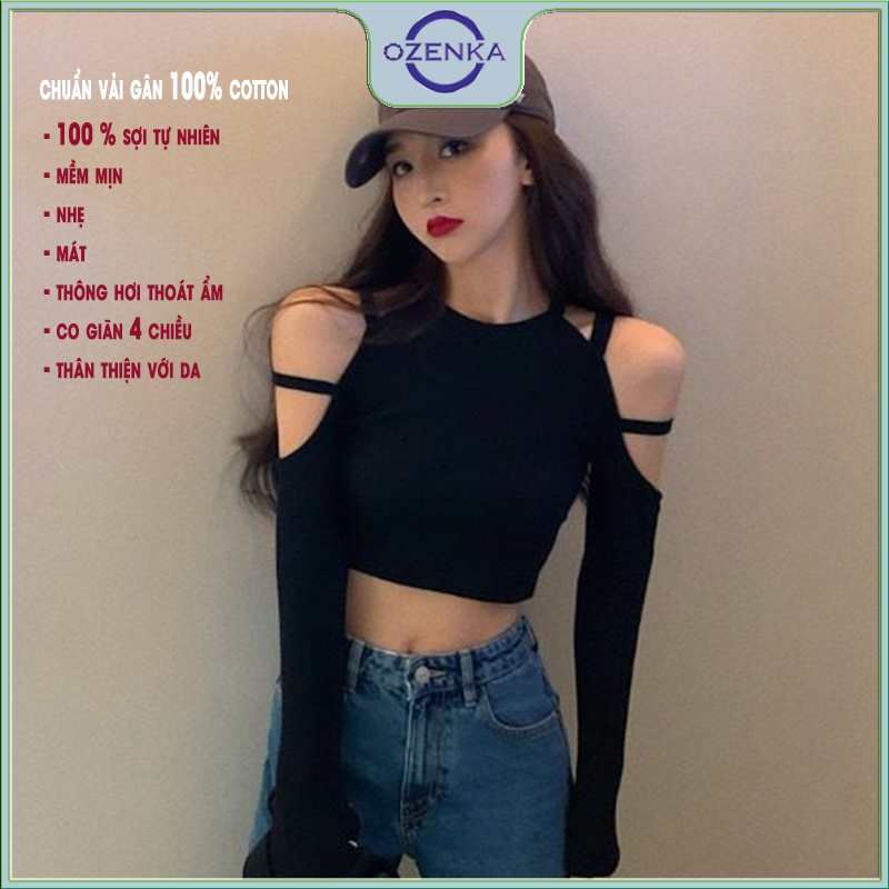 Áo croptop nữ trễ vai tay dài ôm body gợi cảm OZENKA , crt kiểu hàn quốc màu đen trắng dưới 55 kg