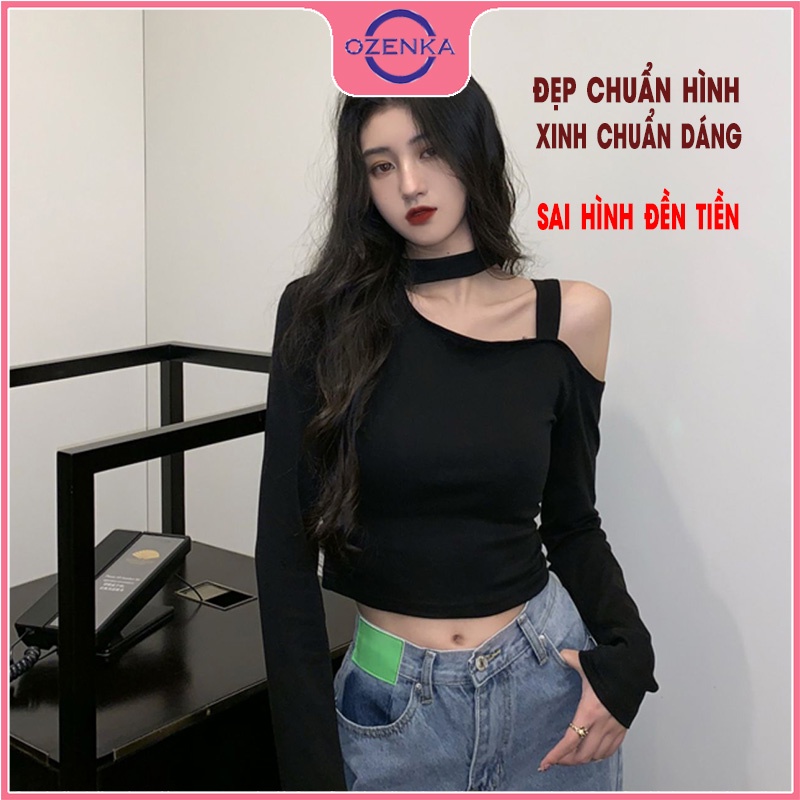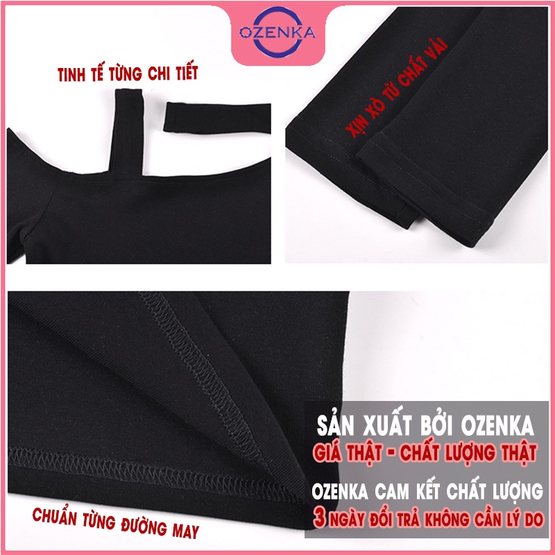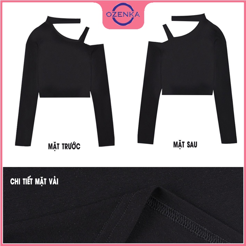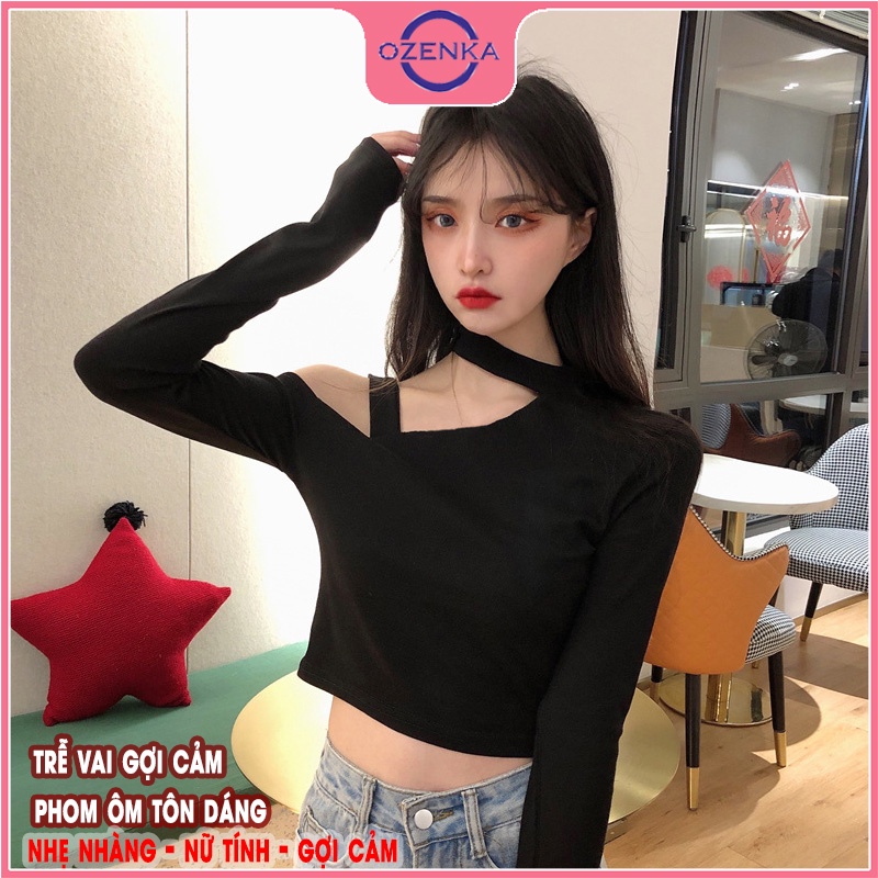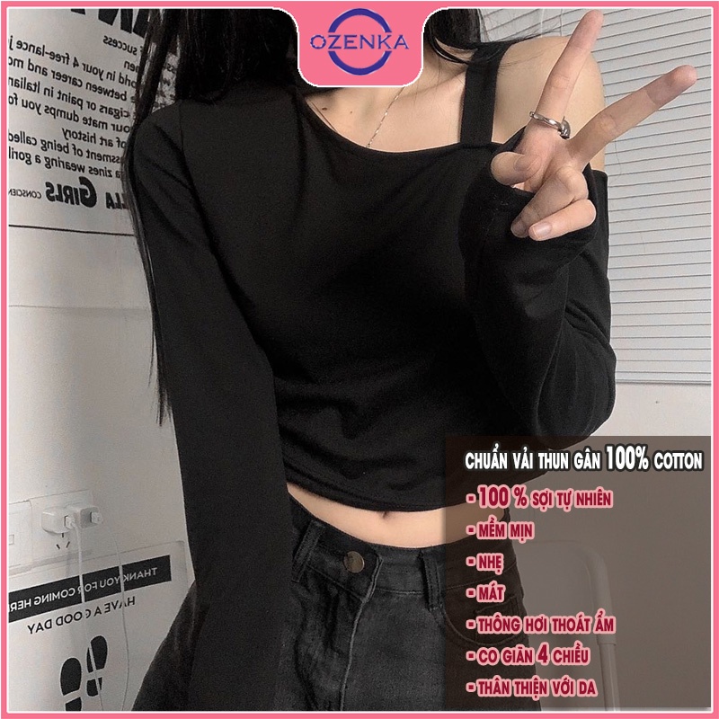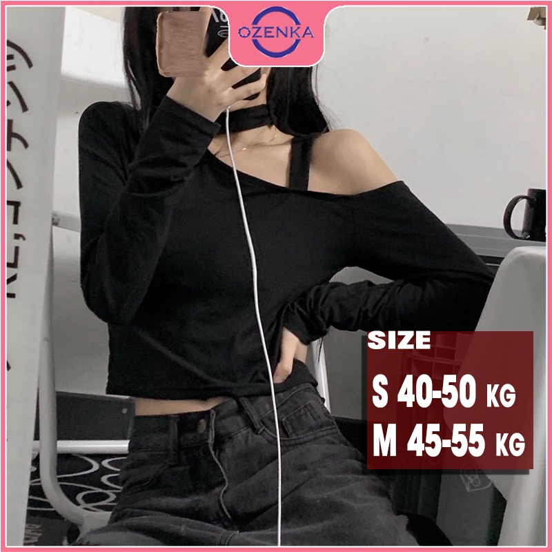 Áo croptop trễ vai tay dài ôm nữ OZENKA, crt đẹp sang chảnh thời trang màu đen trắng thun gân 100% cotton dưới 55kg