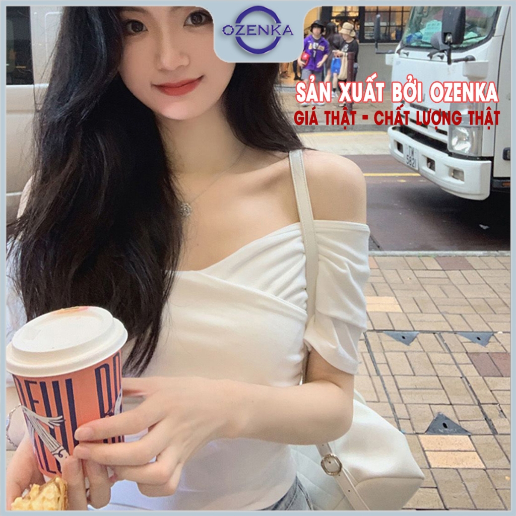 Áo croptop kiểu trễ vai nữ cổ v hở vai đen trắng ozenka , áo crt tay ngắn thời trang mùa hè cotton trơn mịn mềm mát