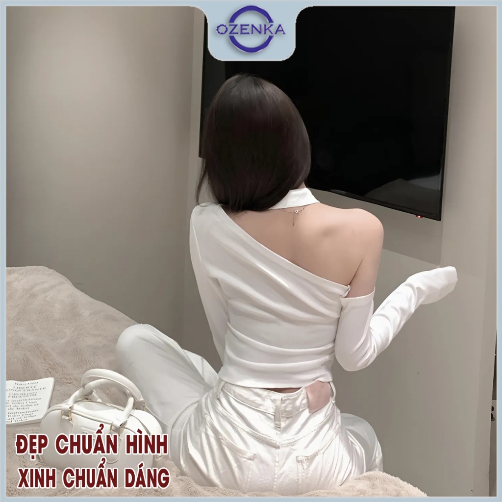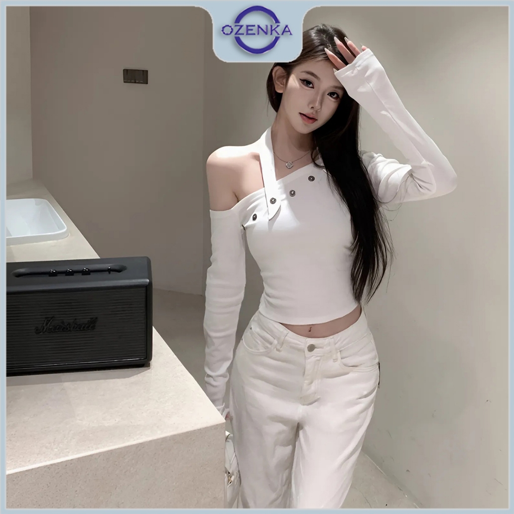 Áo croptop trễ vai kiểu tay dài ôm body sang chảnh đính cúc nữ Ozenka , áo crt thu đông lệch vai thun cotton đen trắng