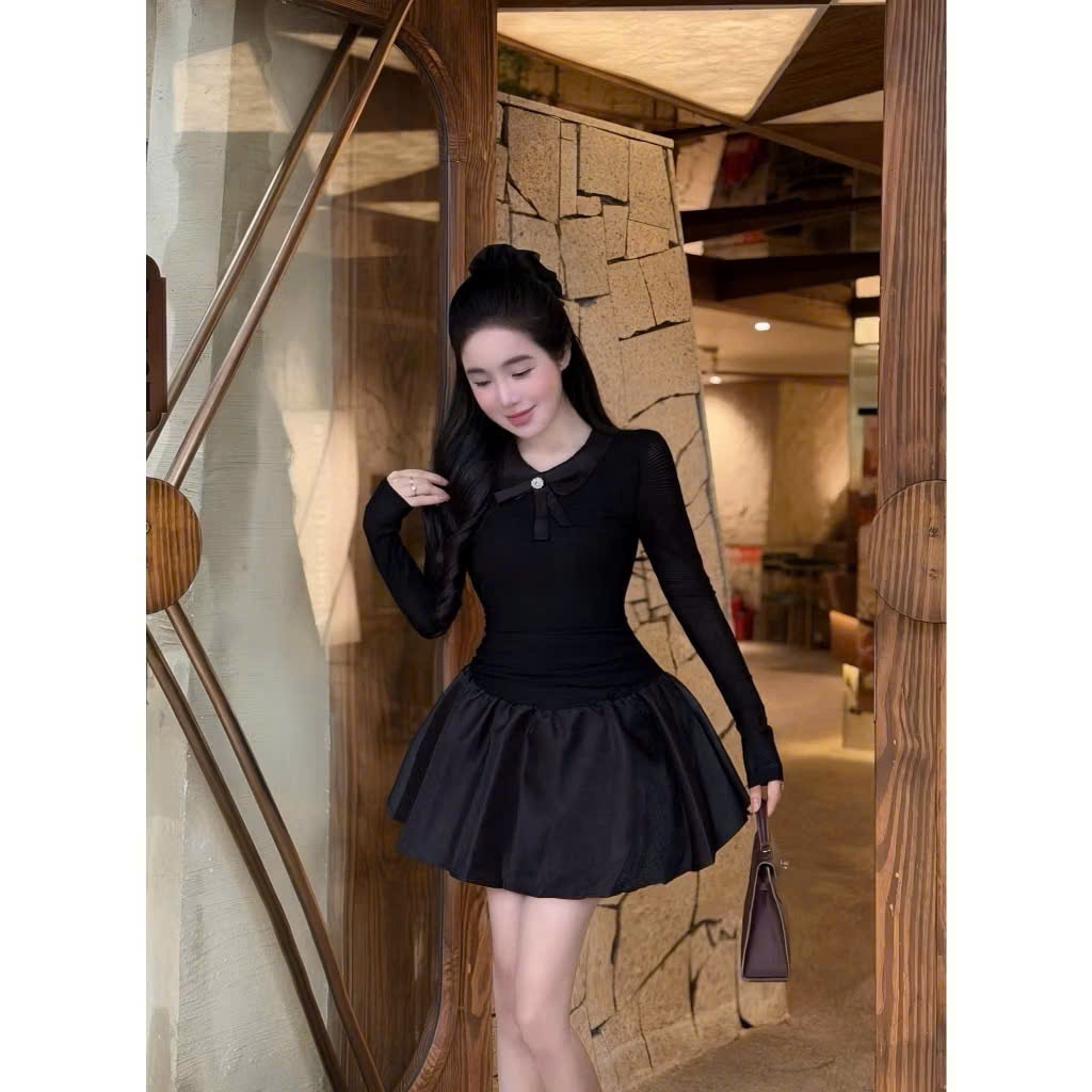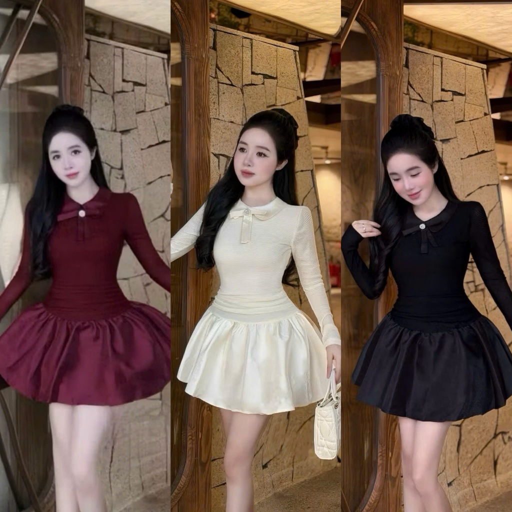 BIGSIZE HIẾU HIẾU (55-100KG) - Váy nữ ôm tay dài dáng xoè cổ đính nơ xinh xắn D637