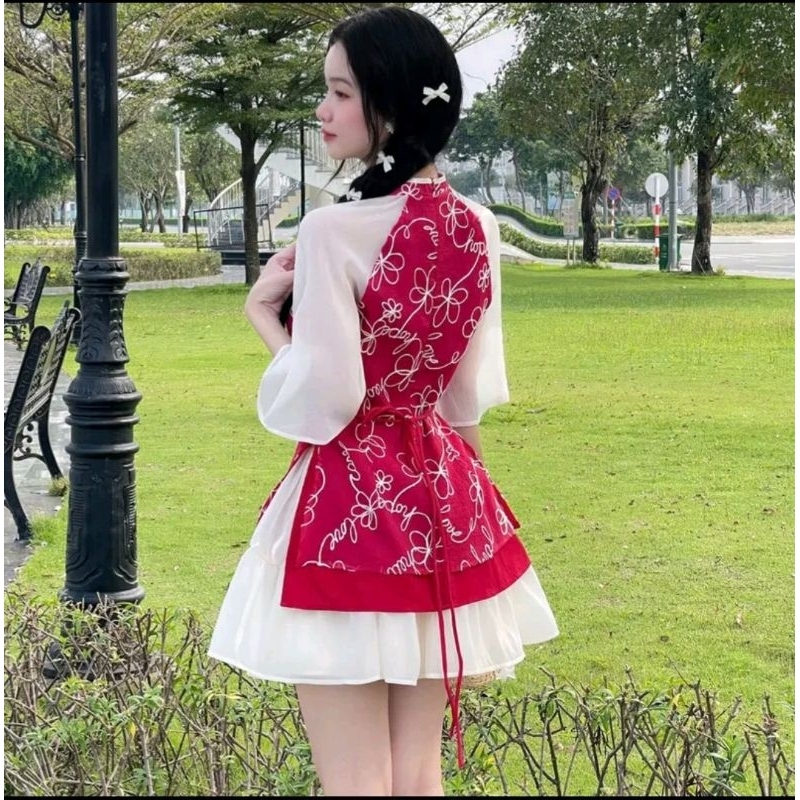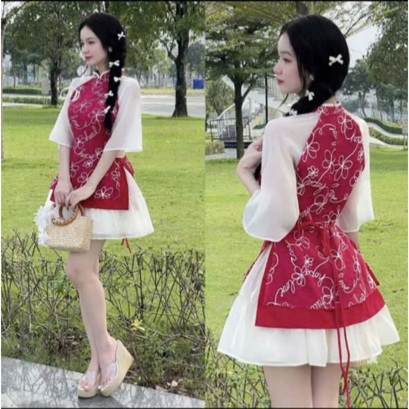 SÉT ÁO DÀI CÁCH TÂN THÊU HOA ĐÍNH NƠ KÈM CHÂN VÁY XÒE TRẺ TRUNG MẶC TẾT SIÊU XINH CÓ 3 MÀU,3 SIZE S,M,L Nữ Tre Top