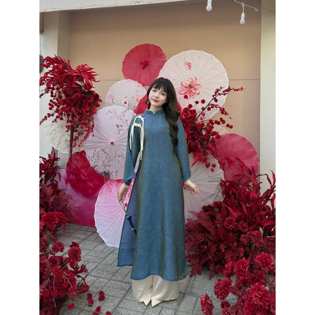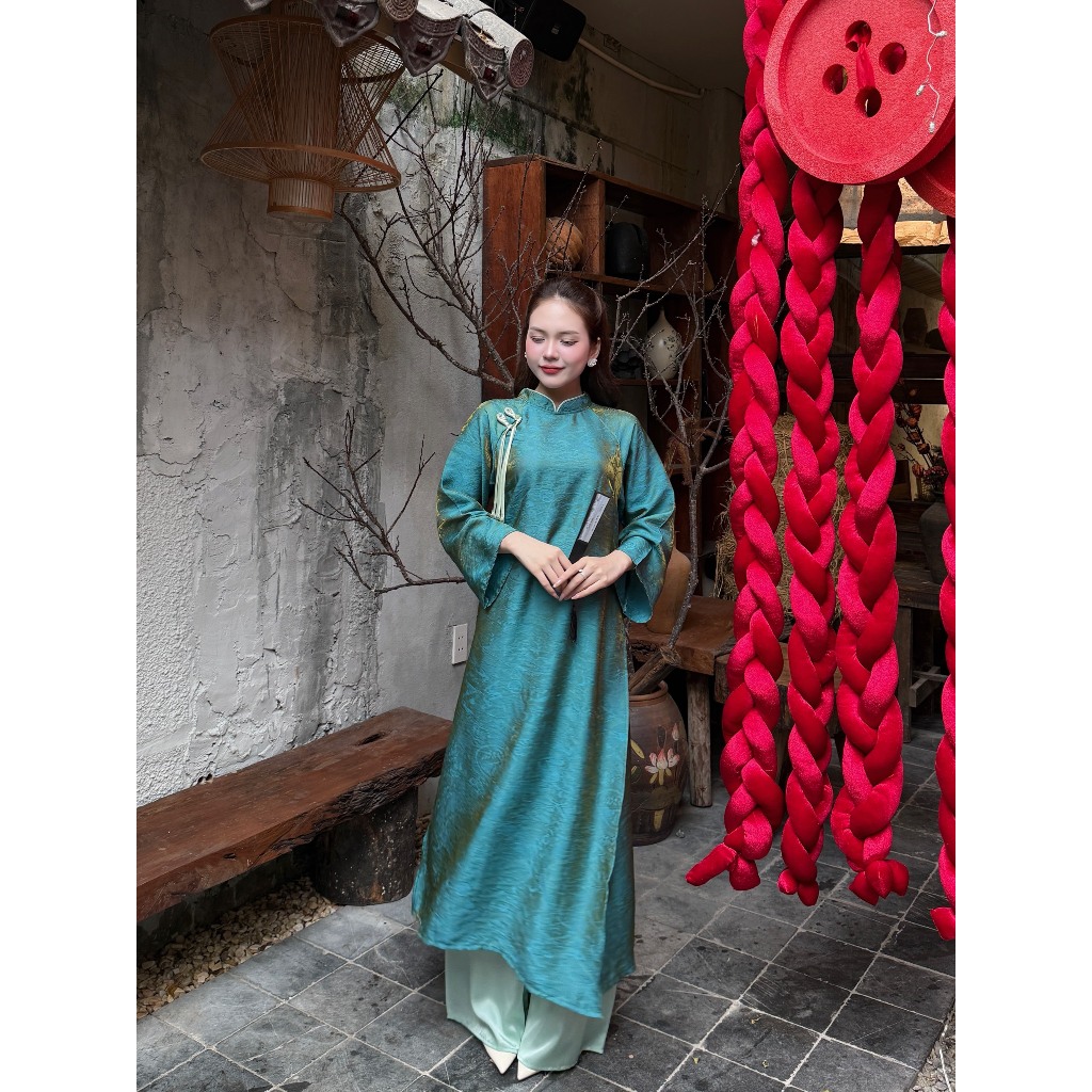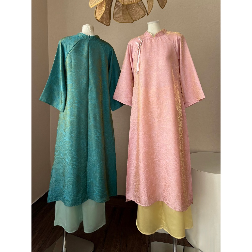 Set áo dài tơ óng hai nơ ngọc quần lụa lưng chun Mẫu mới tết 2026 Ảnh thật/Sẵn