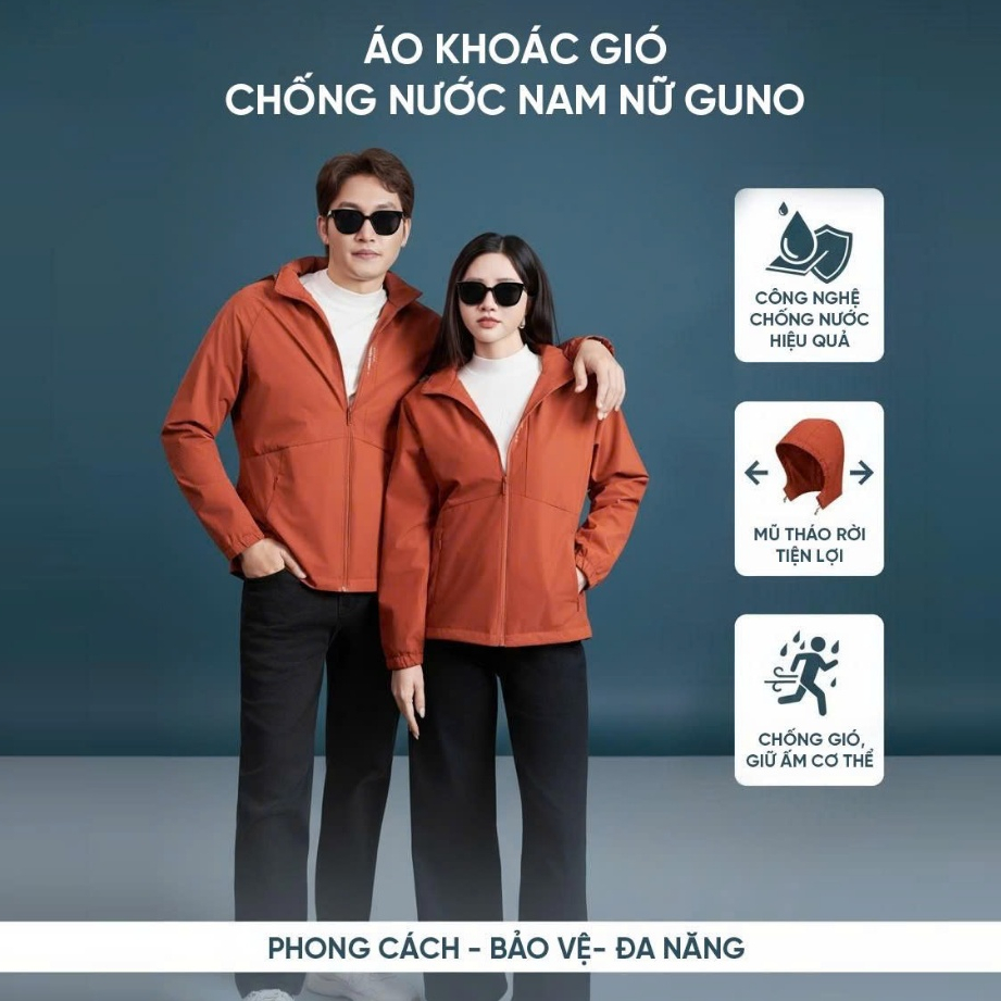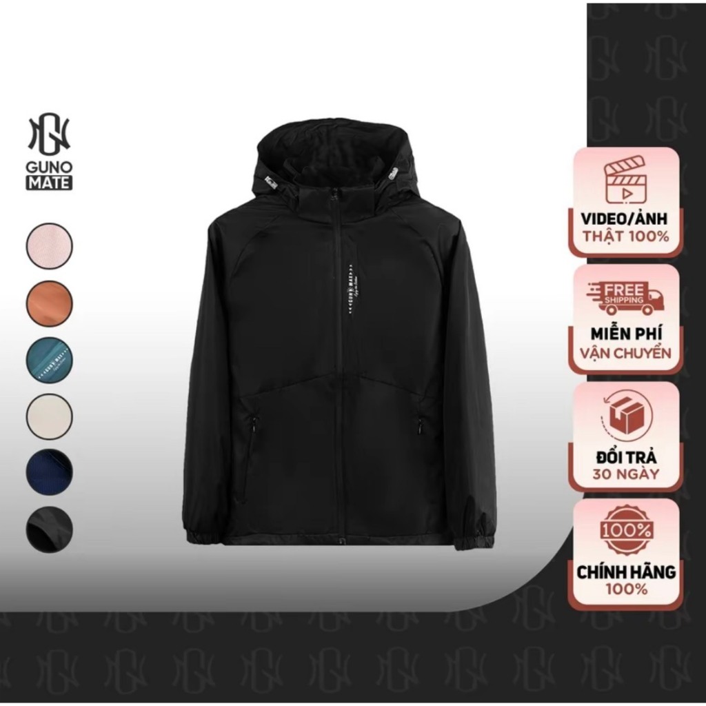 Áo gió nam nữ GUNO trơn 2 lớp lót nỉ có mũ tháo rời chống nước, chống UV bản nâng cấp 25AG140/AB185