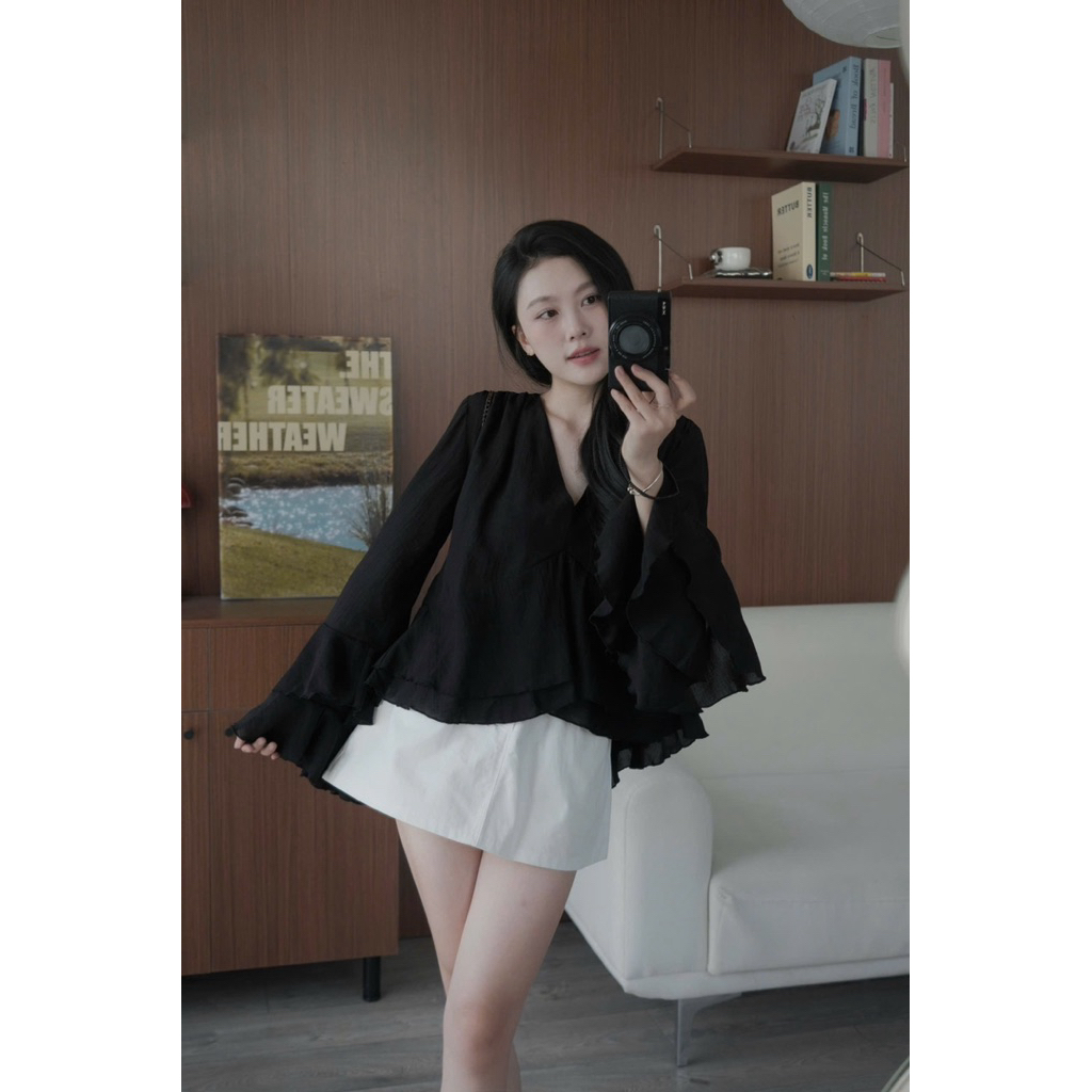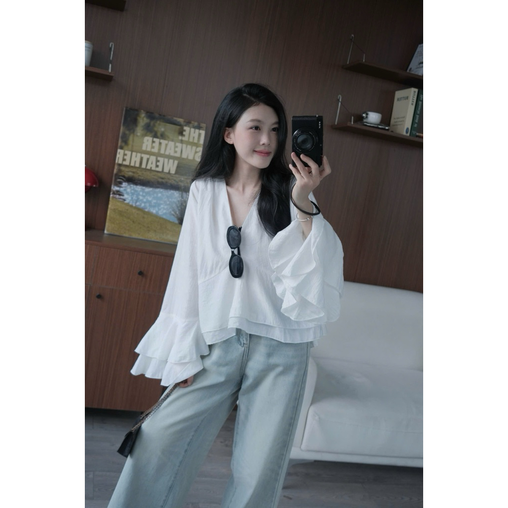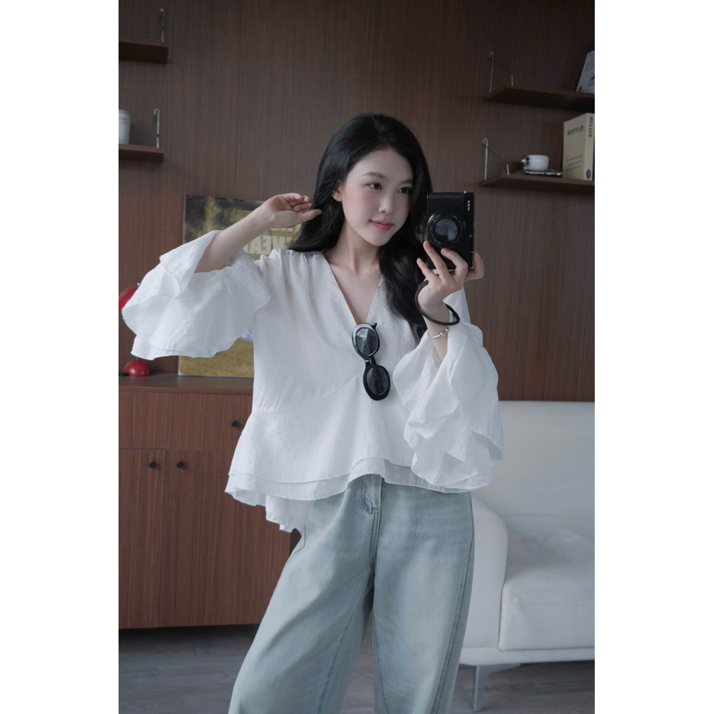 Áo đũi tơ cổ V tay dài loe xoè Nữ the.sweaterweather TSW