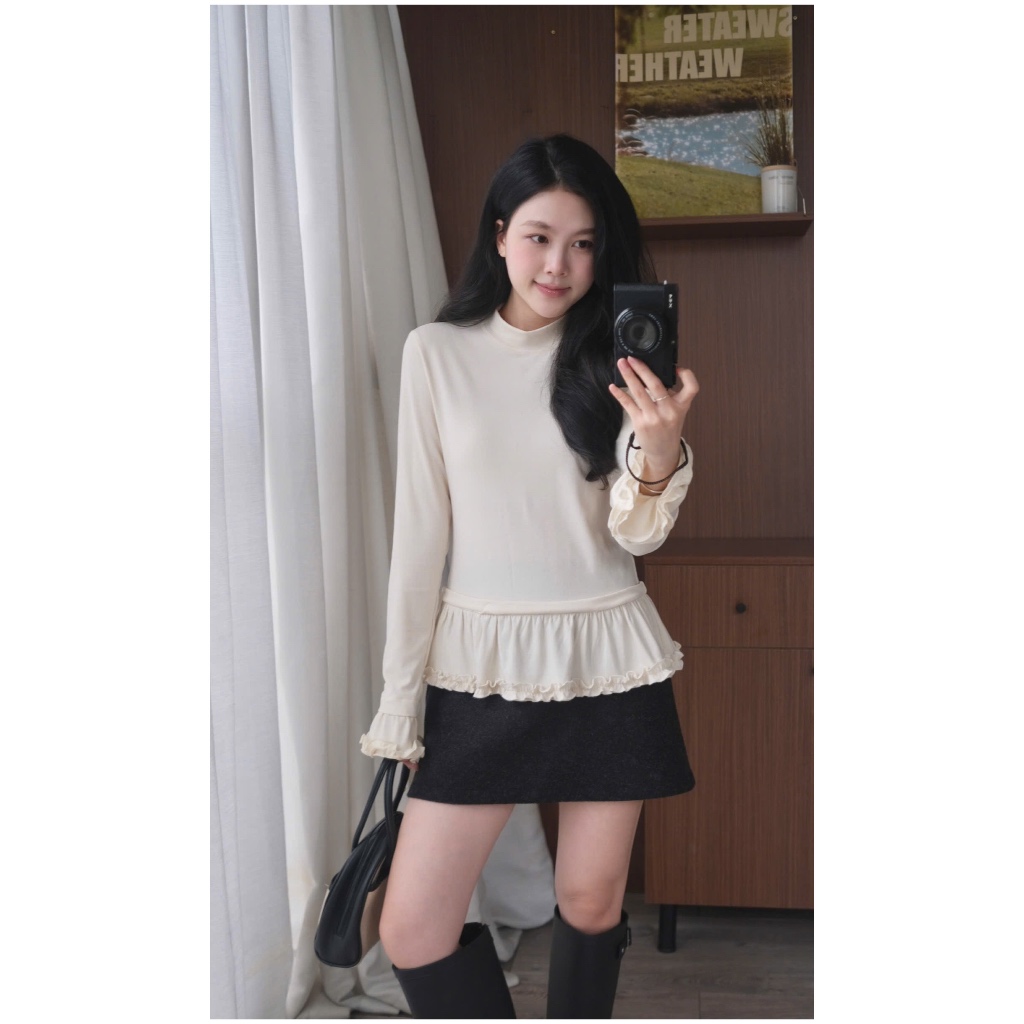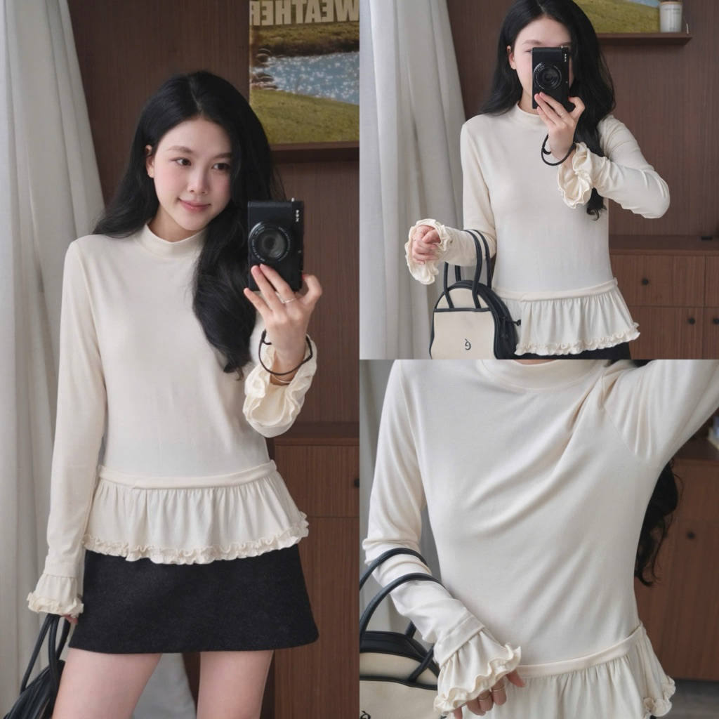 Áo thun giữ nhiệt tay viền bèo Trắng kem Nữ the.sweaterweather TSW