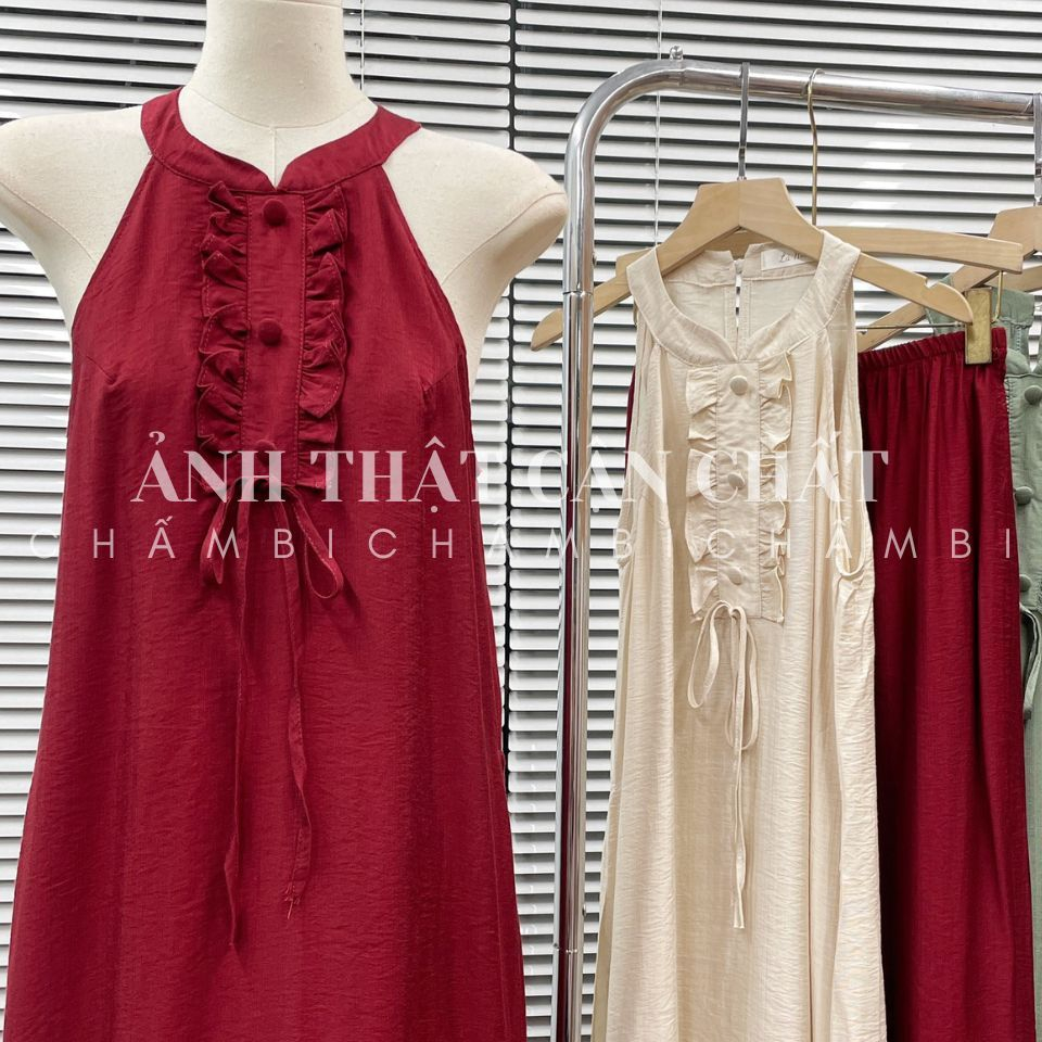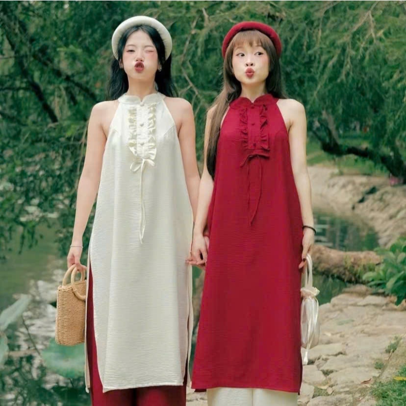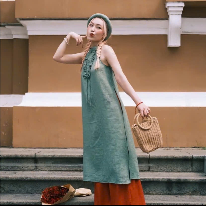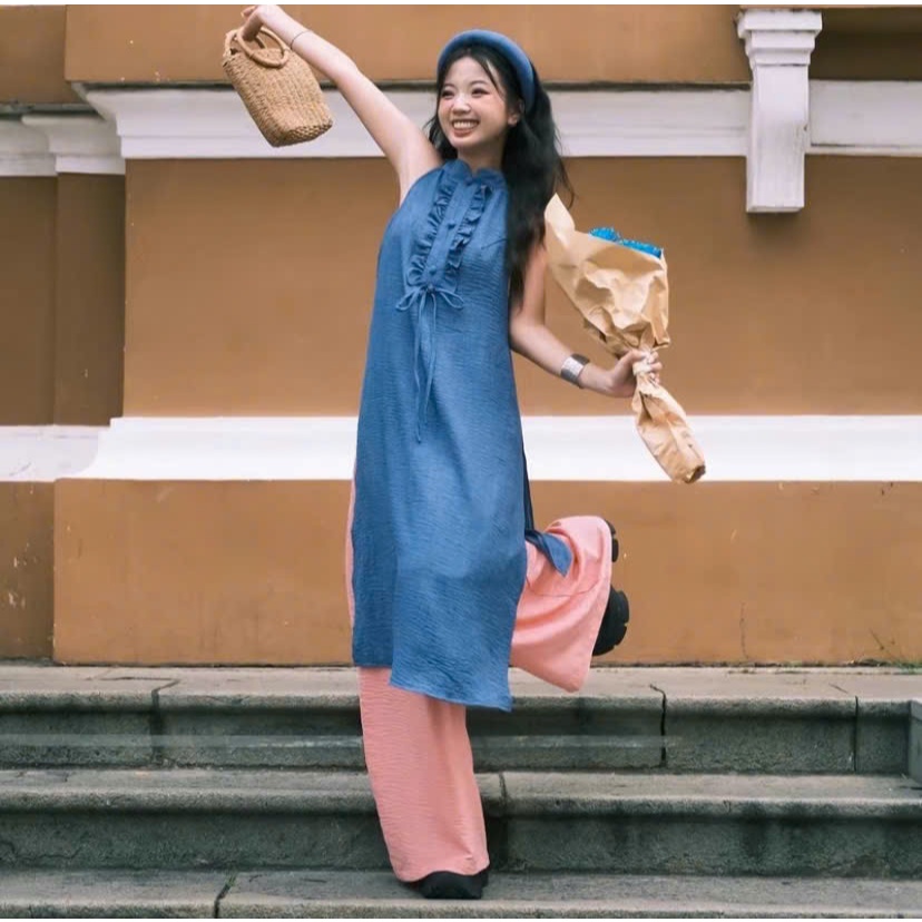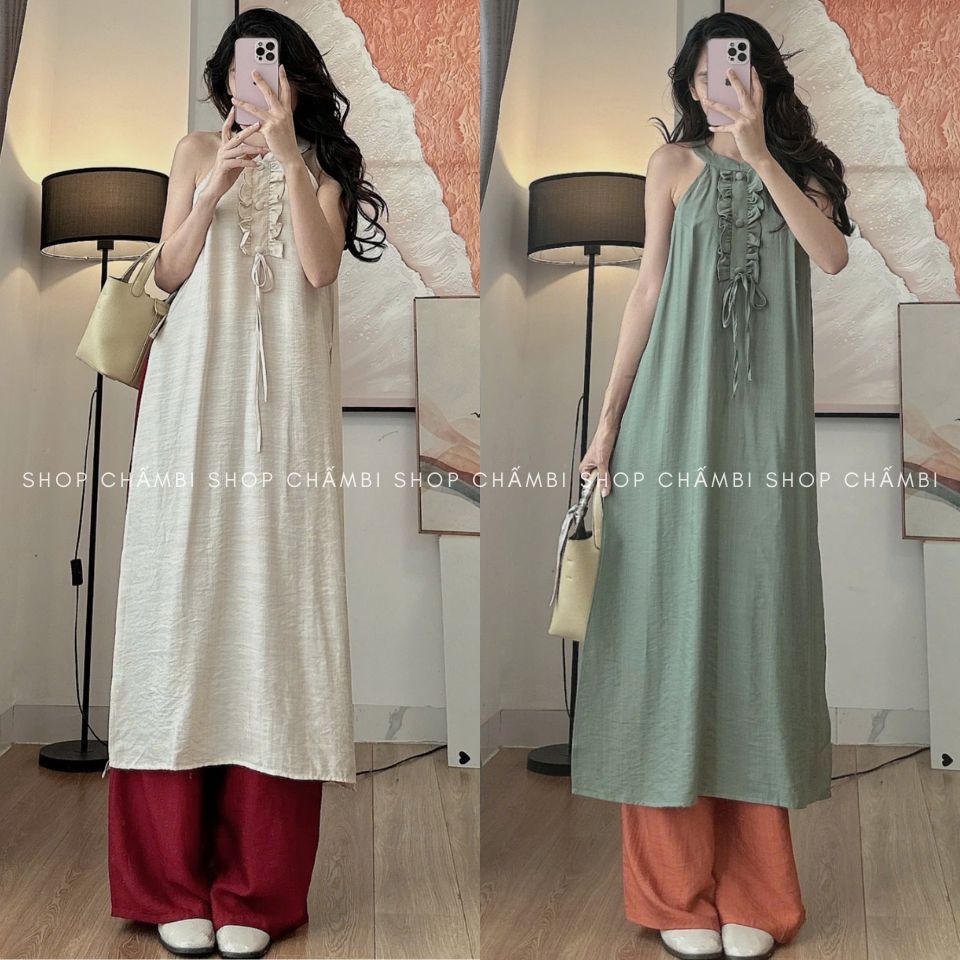 Set áo dài cách tân S.209, Set áo dài cổ yếm 3 cúc bọc chất đũi mềm mại phong cách vintage - Shop Chấm Bi
