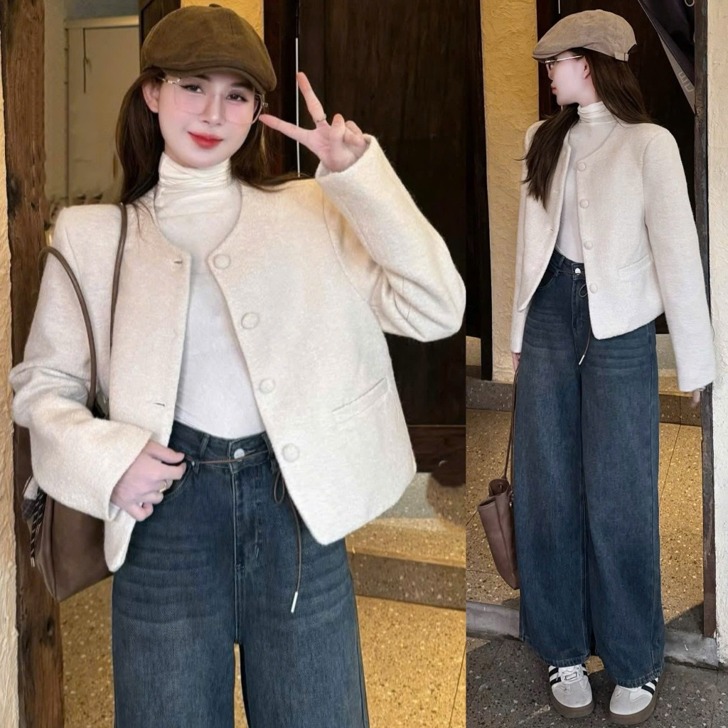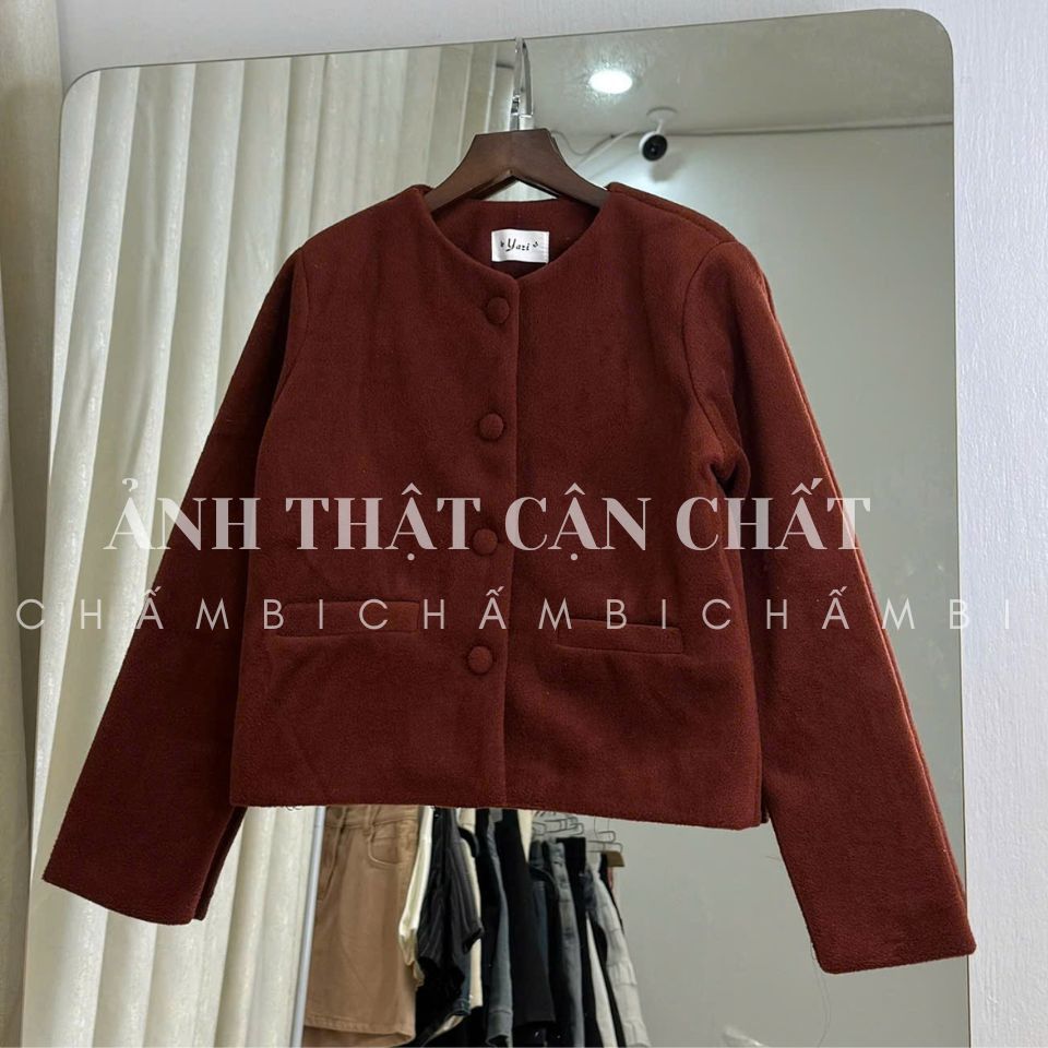 Áo dạ nữ A.697, Áo dạ lông xù dáng lửng cổ tròn tay dài phối cúc dọc túi ngang Hàn Quốc - Shop Chấm Bi