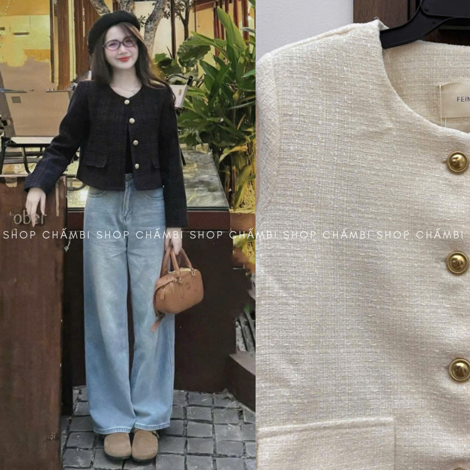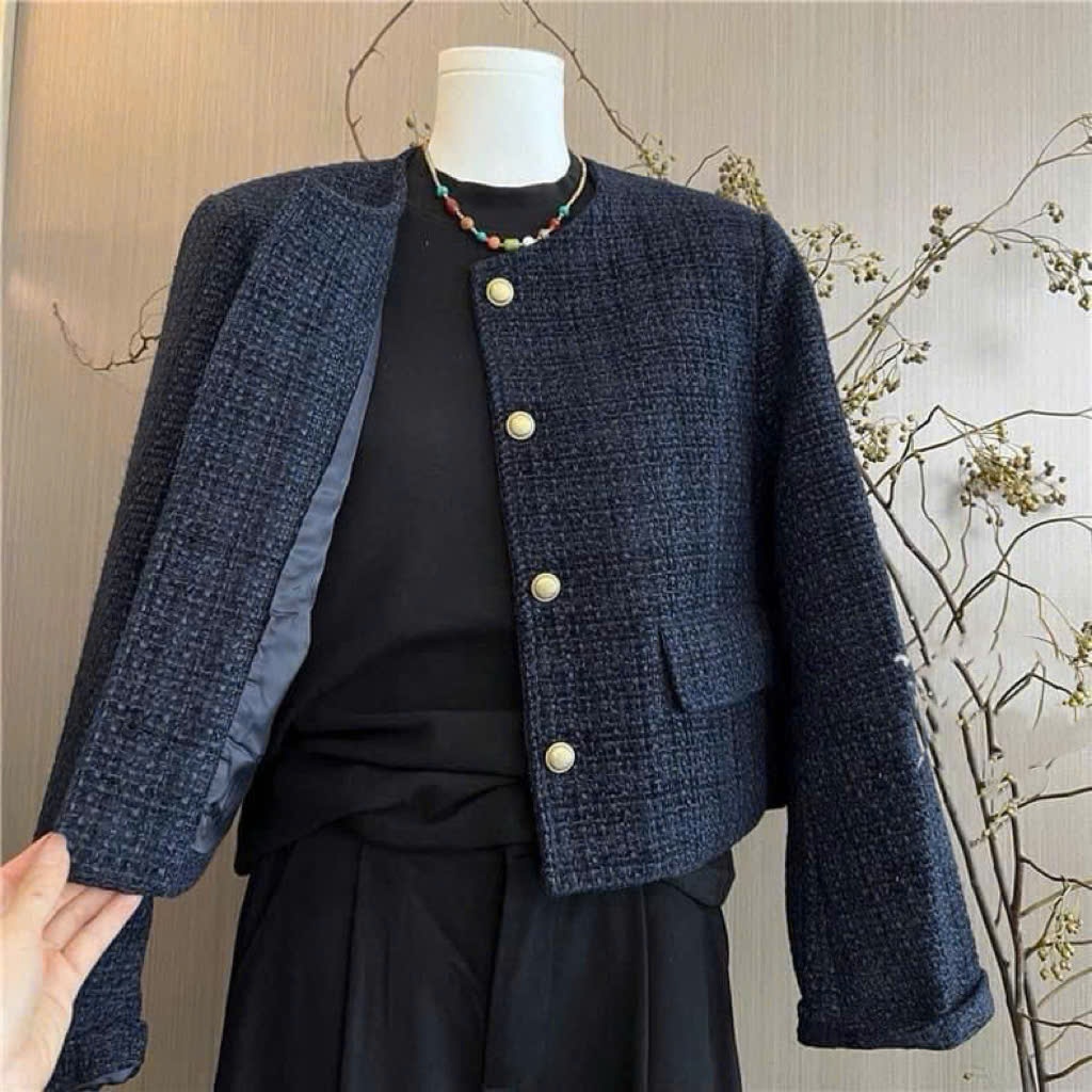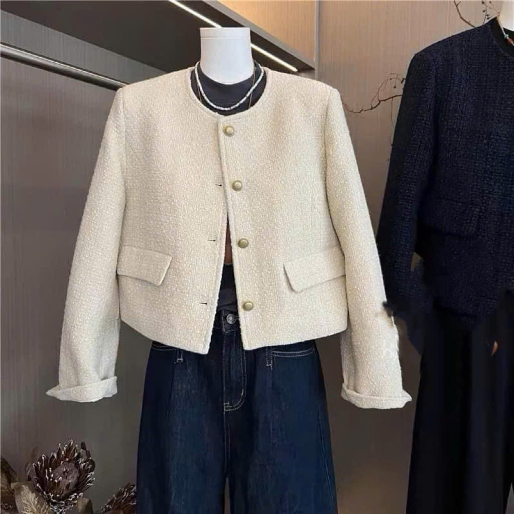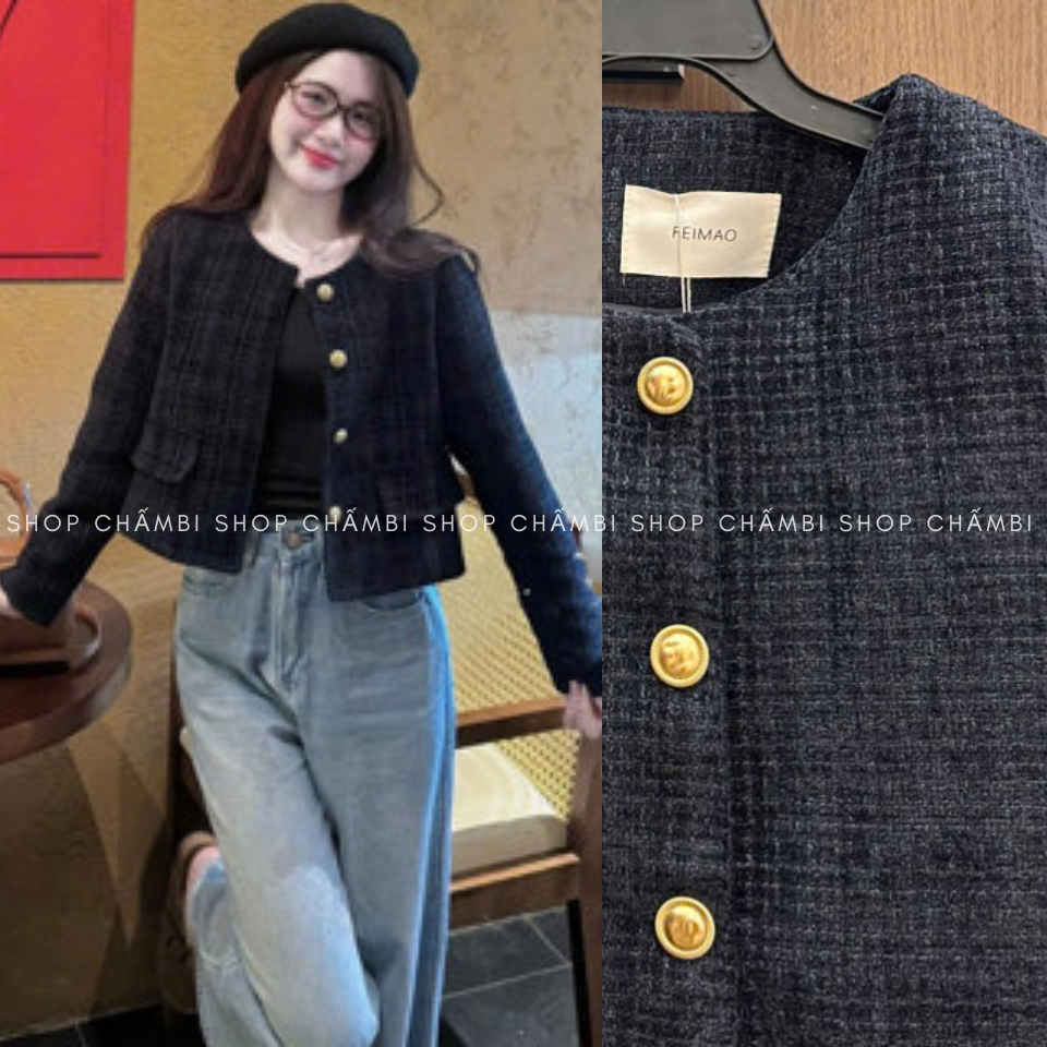 Áo dạ tweed A.688, Áo dạ lửng nữ dài tay cổ tròn 2 túi nắp phong cách thanh lịch - Shop Chấm Bi