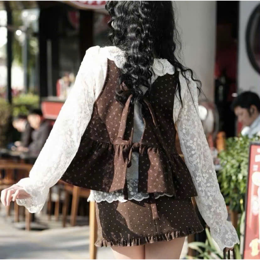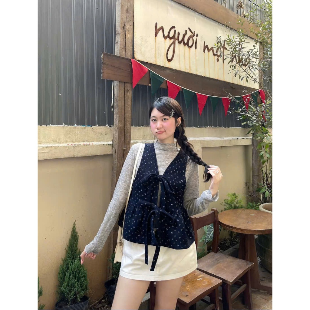 Áo Yếm nữ A.818, Áo Yếm dạ hoa nhí dáng vừa bồng nhẹ phối 2 nơ to buộc có thể mặc 2 kiểu vintage - Shop Chấm Bi