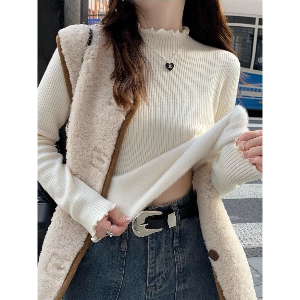 【Sẵn Full-Ảnh Thật Shop】Áo len Gân Lót Lông dày Dặn ,Áo Len Nữ Cổ Cao Bo Xoắn Dáng Ôm Lót Lông ấm Áp
