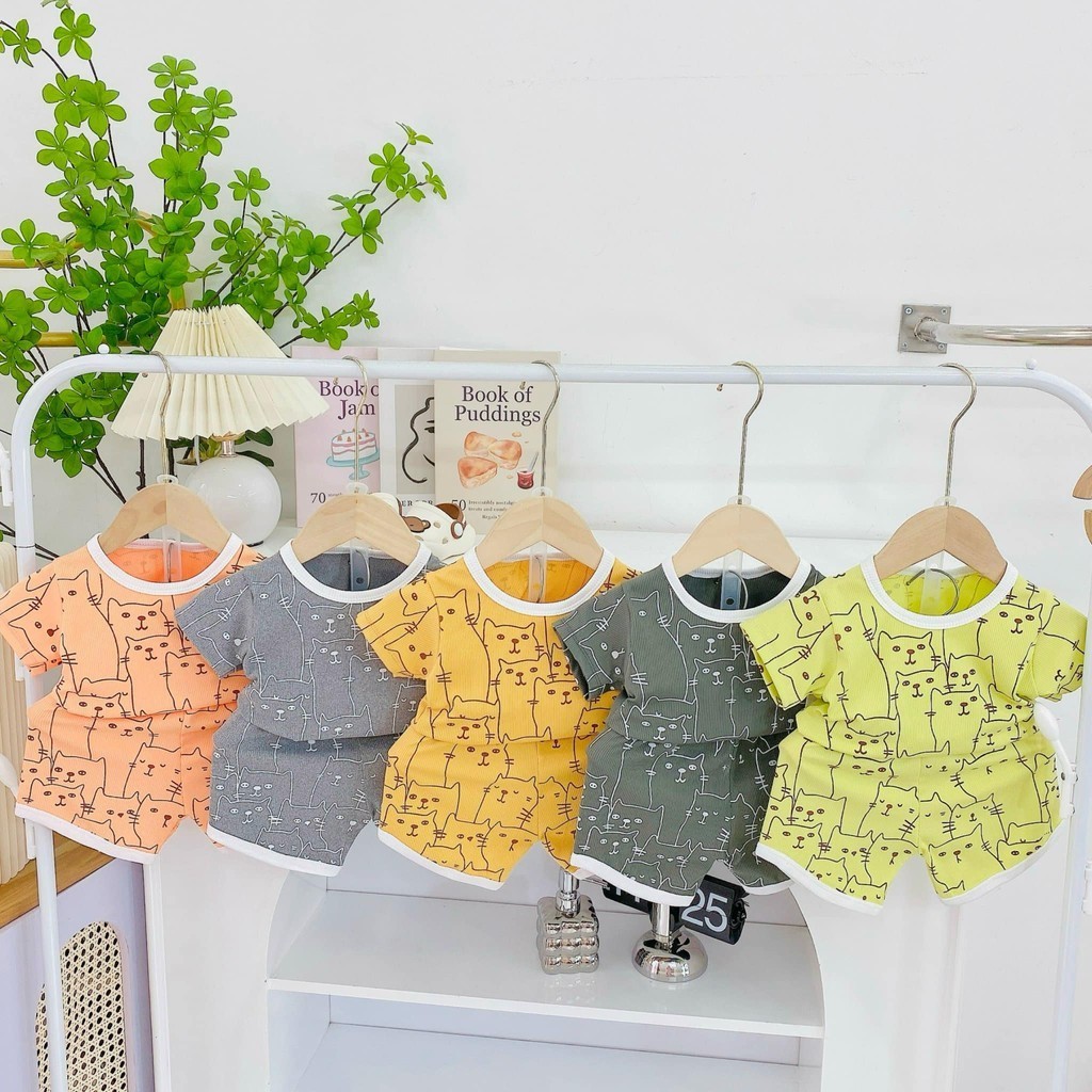 Bộ cộc vải tăm tre in hình mèo mềm mát cho bé mặc hè