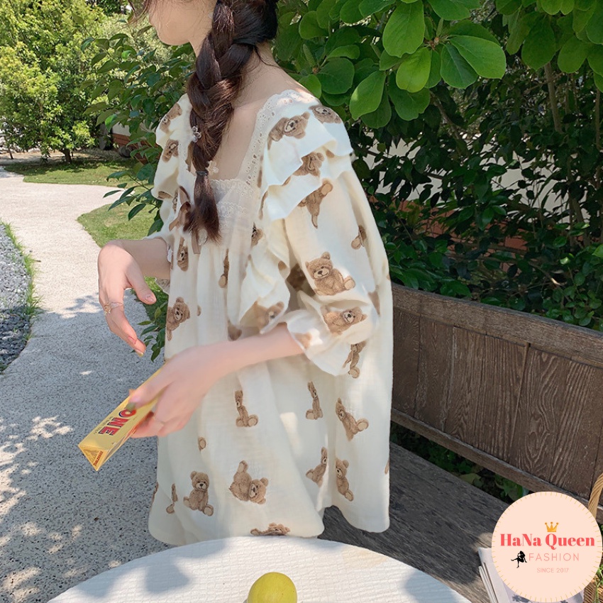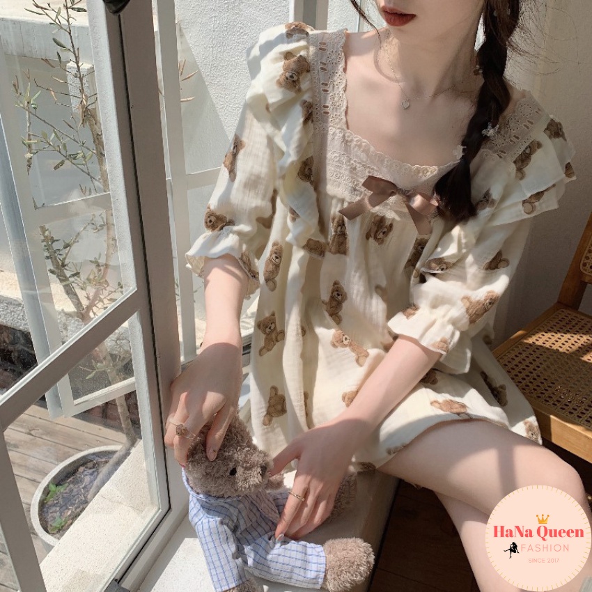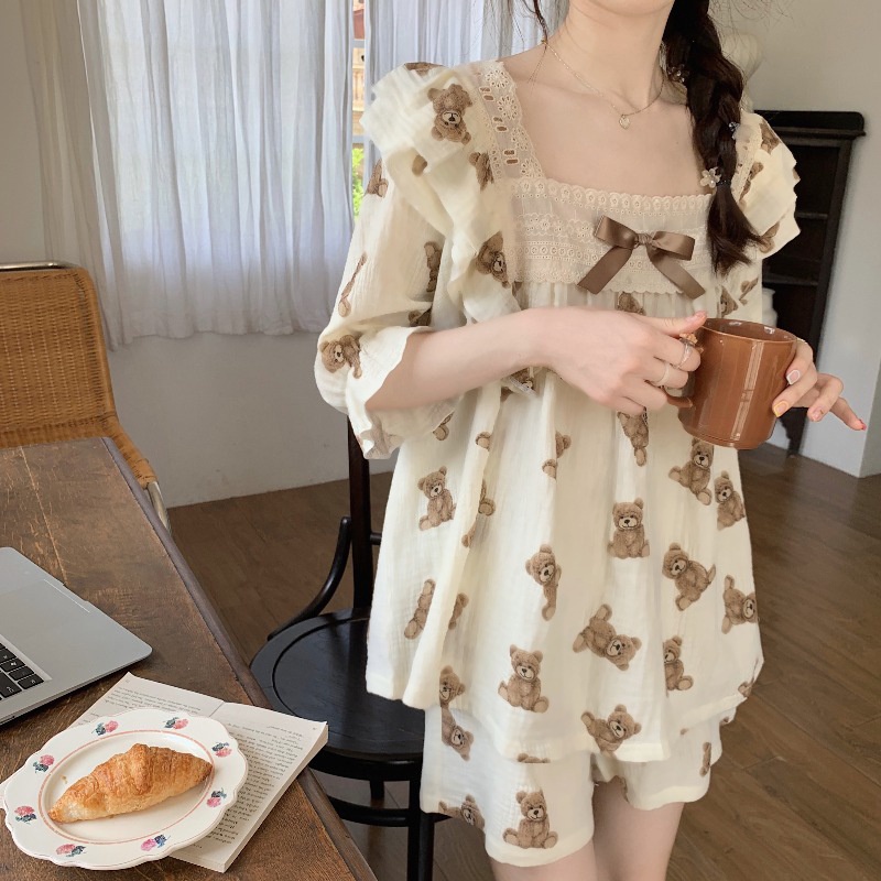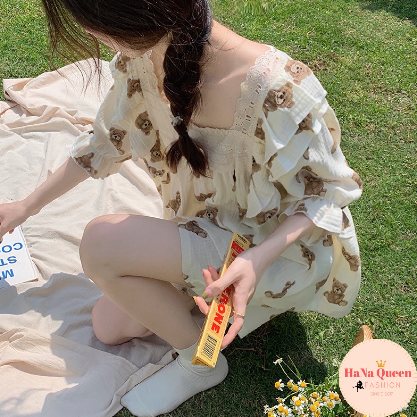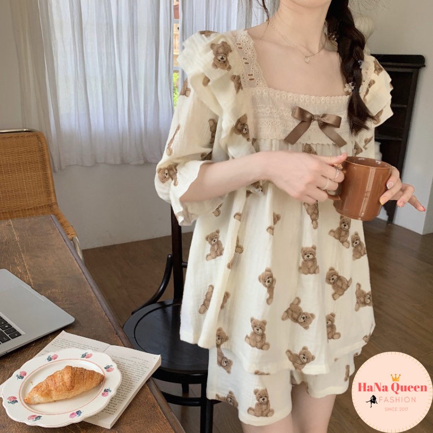 [Xả Kho] Bộ đồ tay lỡ quần đùi phối ren hoạ tiết gấu siêu xinh