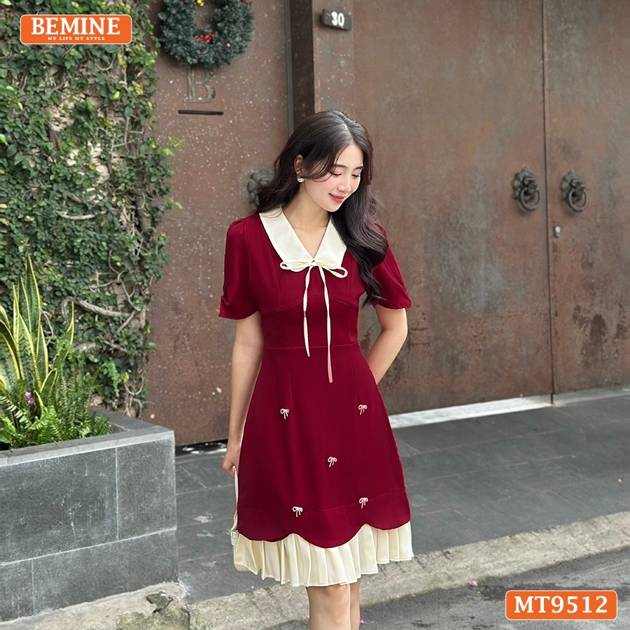 Đầm thiết kế BEMINE cổ sen đính nơ tùng xếp ly phù hợp đi chơi, đi dạo phố-MT9512