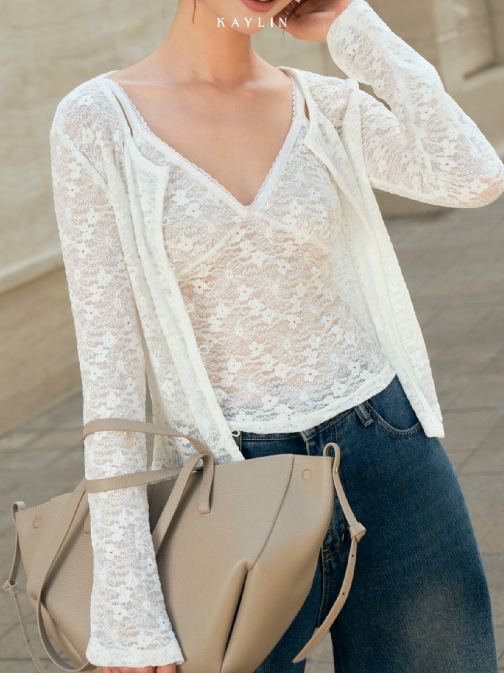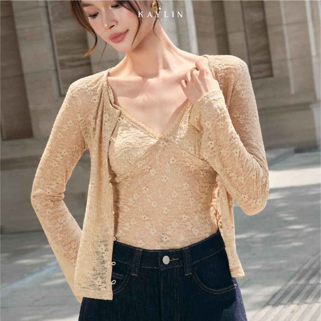 Set KAYLIN áo Cadigan phối áo 2 dây chất vải ren lưới thêu hoa phong cách gợi cảm - A141T2
