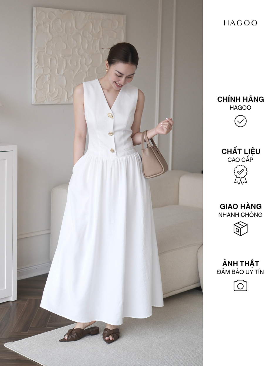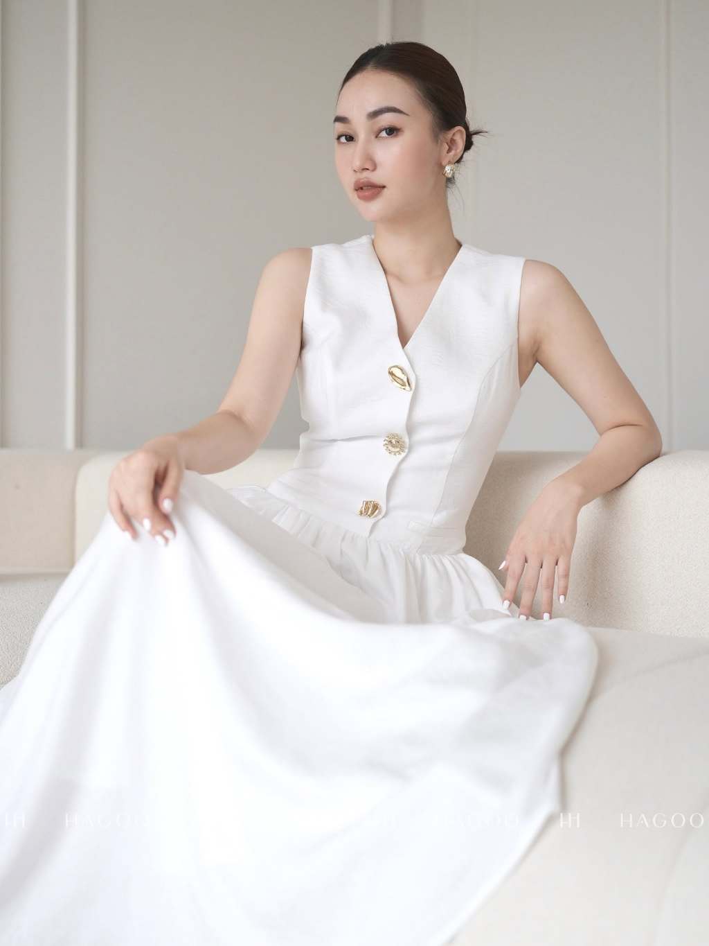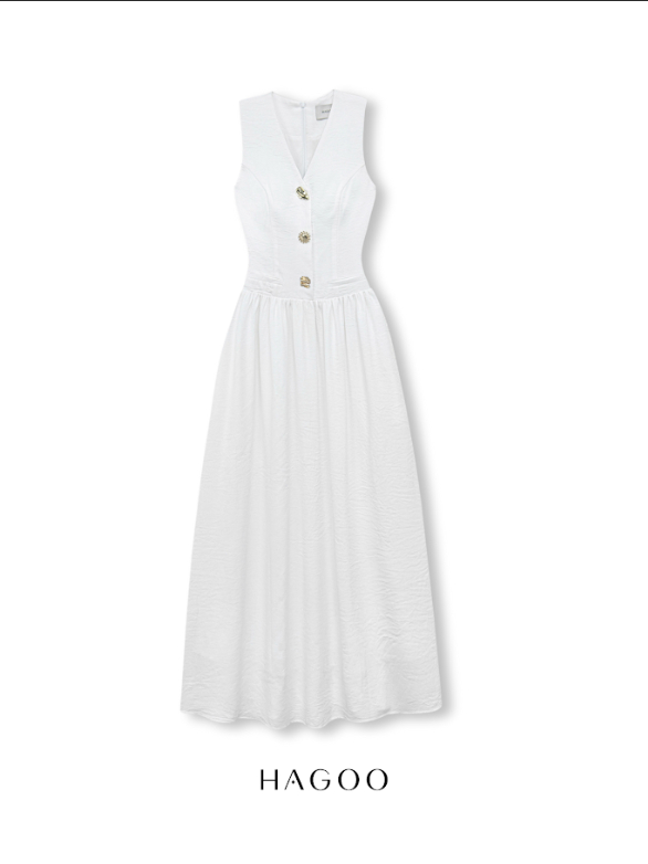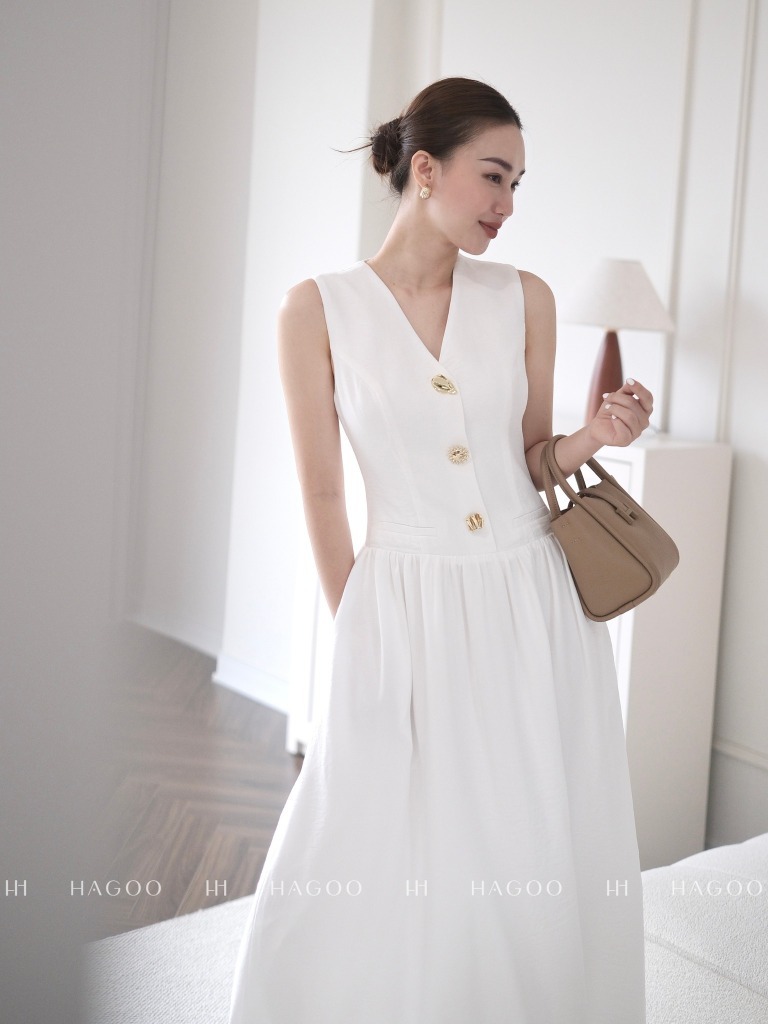Váy đũi tơ xoè cúc đồng không tay dáng dài HAGOO ONLY TRẮNG S [V649]