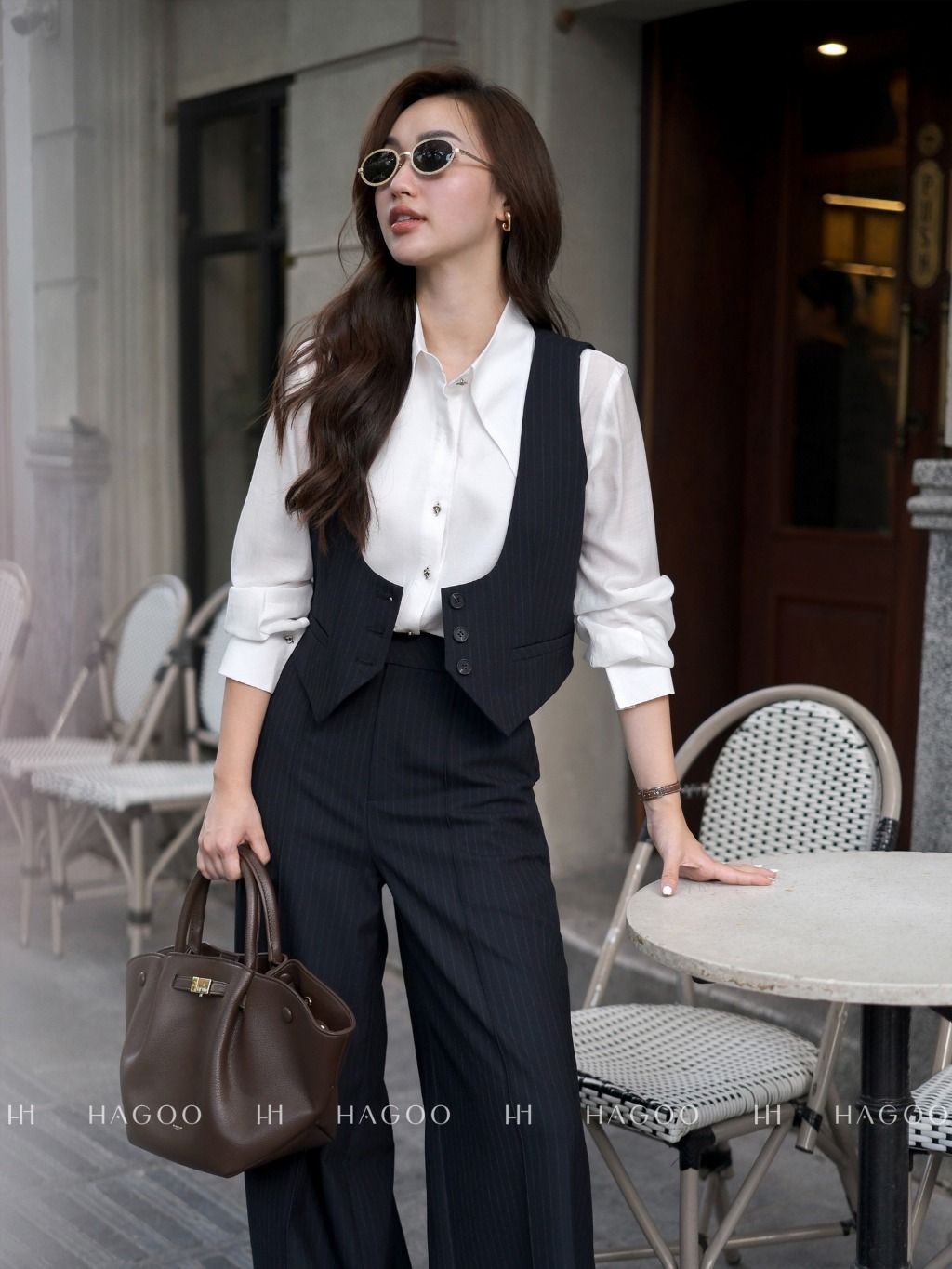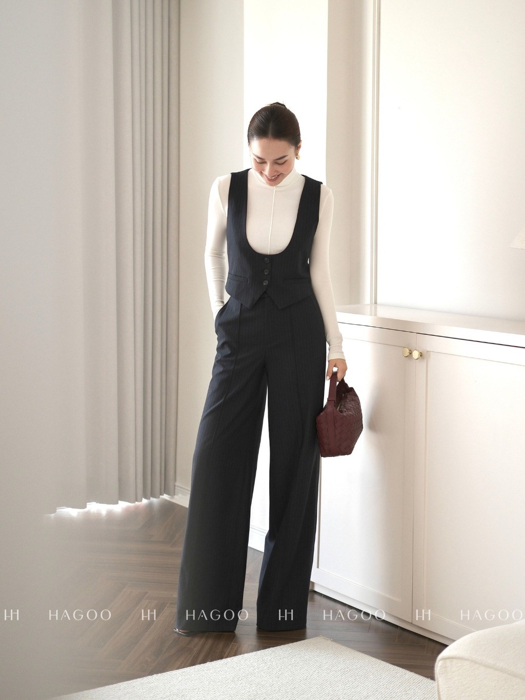 Áo ghile cổ U và Quần suông kẻ HAGOO phong cách công sở thanh lịch [A9031-Q9031]