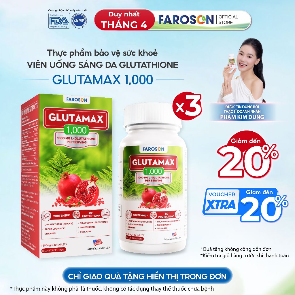 [3Hộp] TPBVSK Viên Uống Trắng Da Glutathione Faroson Glutamax 1000 Sáng Da Giảm Nám Hộp 30 Viên
