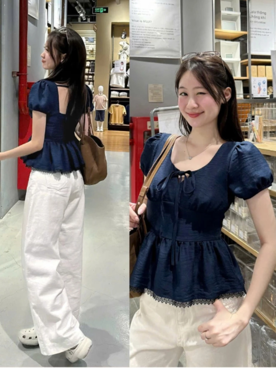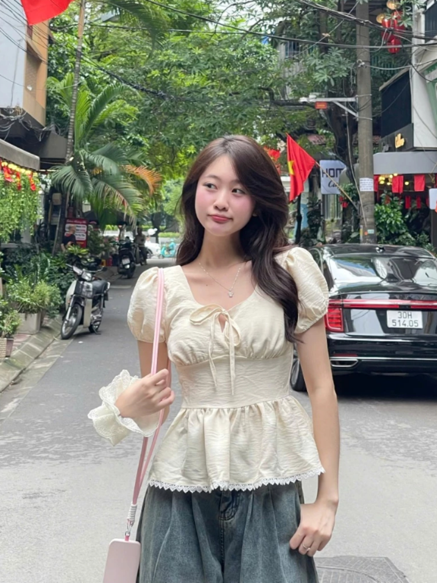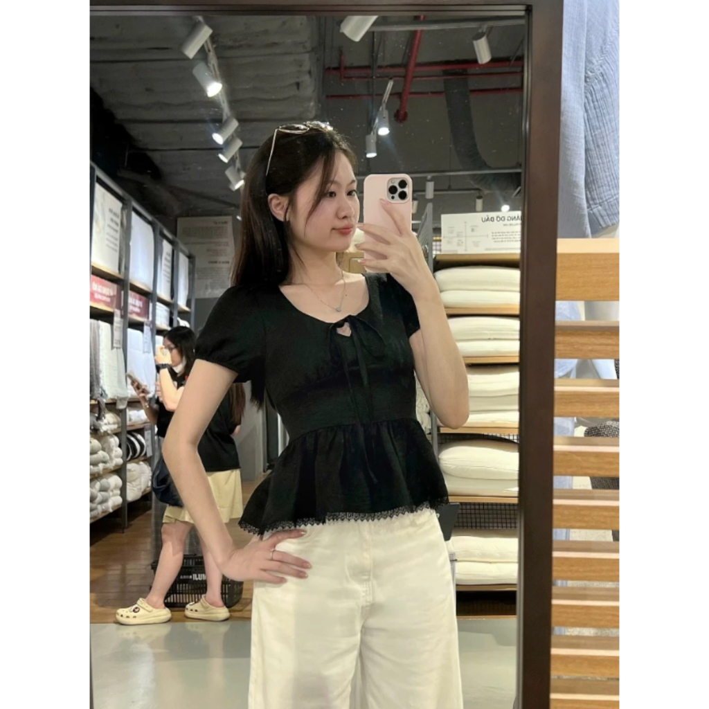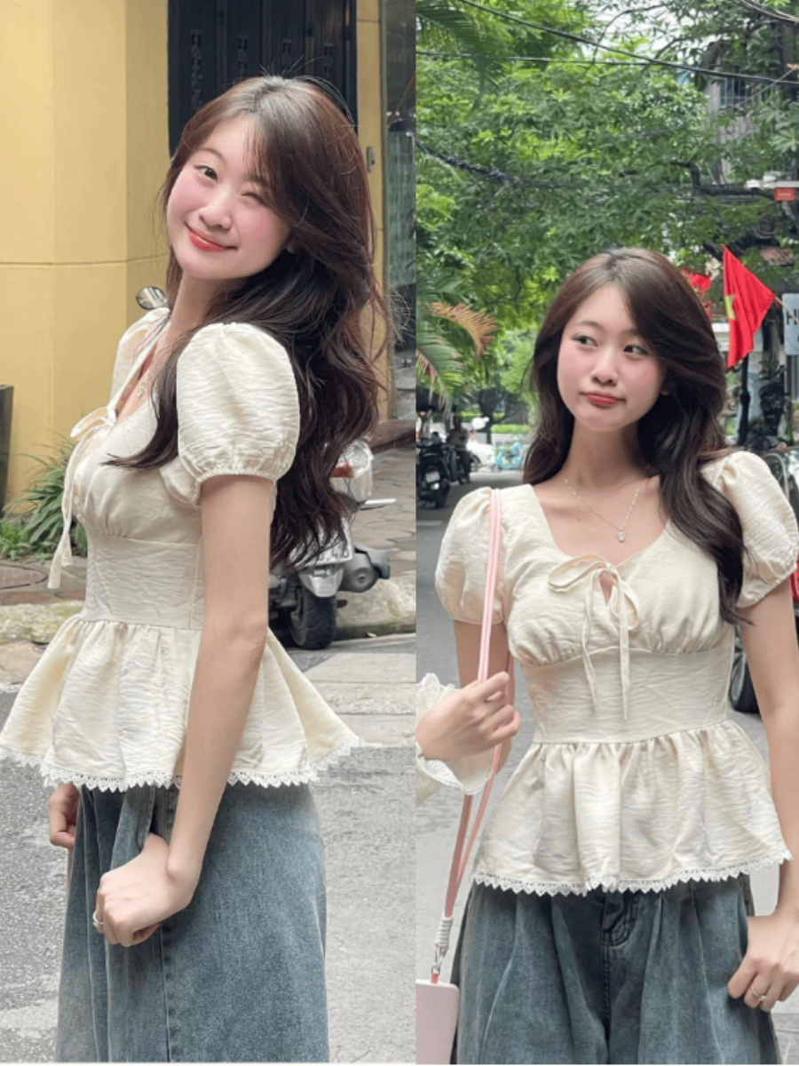 𝐁𝐀𝐑𝐄_Áo Kiểu Nơ Buộc Bo Eo Tay Bồng Pha Ren, Áo Babydoll Trễ Vai Thời Trang Nữ Có Bigsize_A745