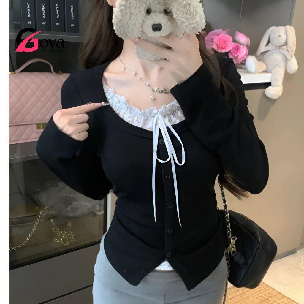 Áo tay tài Cài Nút 2 Lớp Phối Cổ Bèo Ren dáng dài, Áo thun nữ tay dài Cổ Ren điệu đà ADD157 Gova