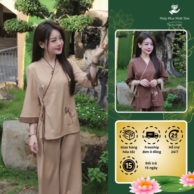 Ms35 Set đồ lam đi chùa thêu Buông vải kate Bộ đi chùa nữ cổ v cúc bọc thêu Buông