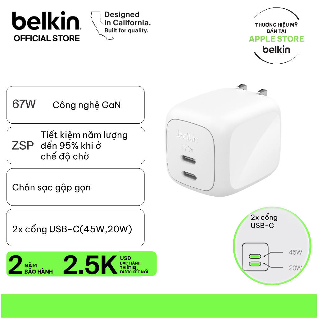 Củ sạc nhanh Belkin BOOST CHARGE 67W chuẩn USB-C 3.1 với 2 cổng USB-C dành cho Macbook, iPad, iPhone Bảo hành 2 năm