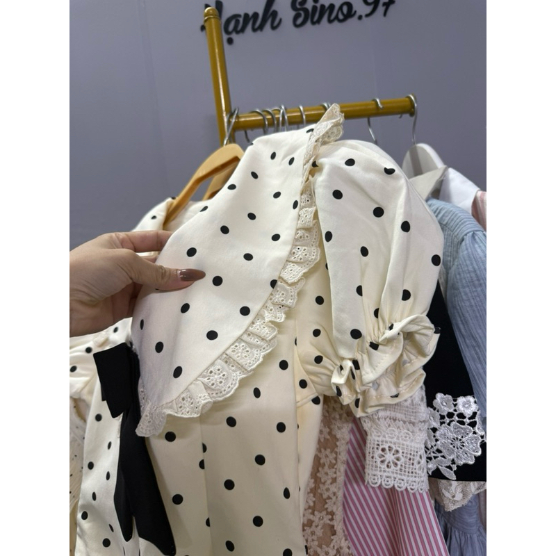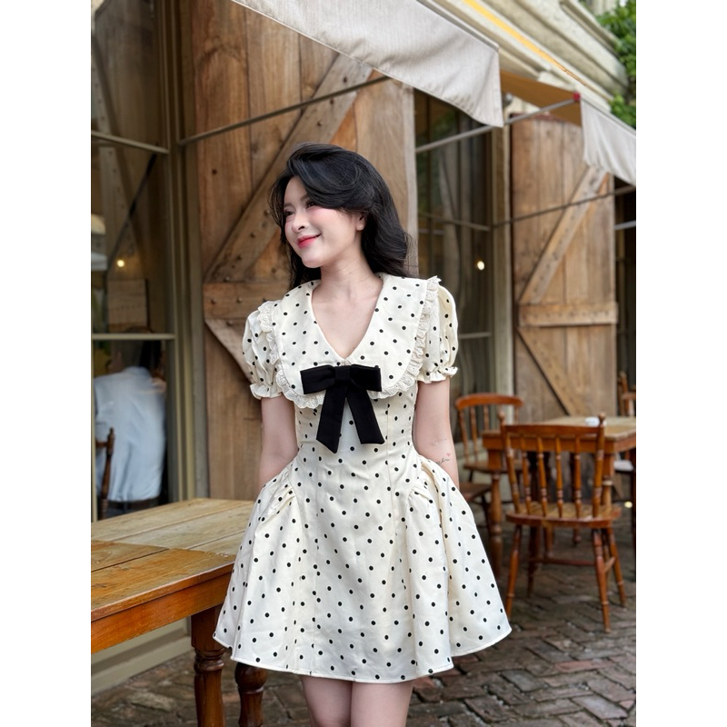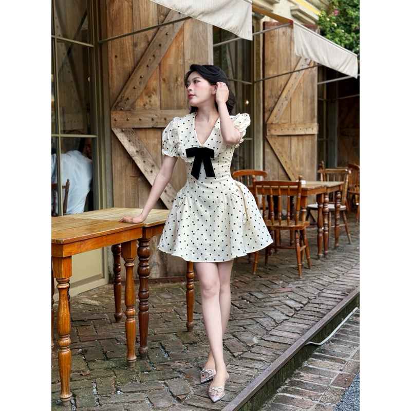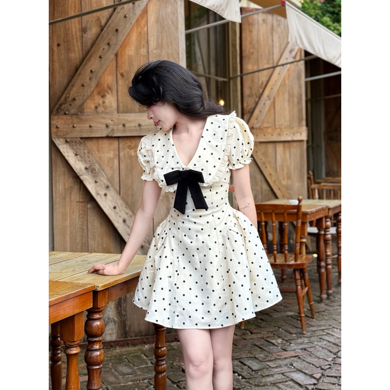 Hạnh sino.97 Váy chấm bi xoè dáng ngắn nơ đen tay bo chun
