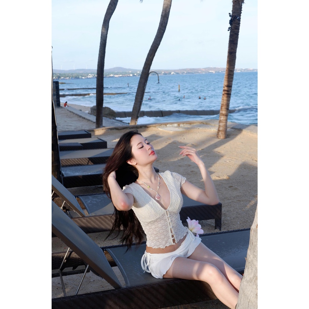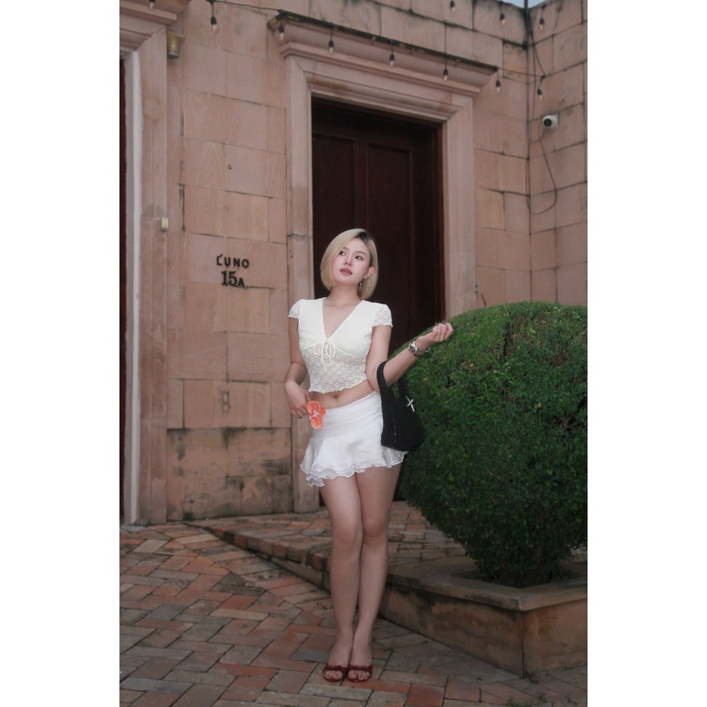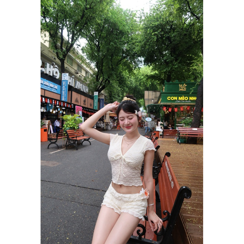 Áo kiểu xinh nữ trắng cúc ngọc trai ByVeeStyle, áo thun nữ ôm body croptop dễ phối đồ chi chơi, hằng ngày