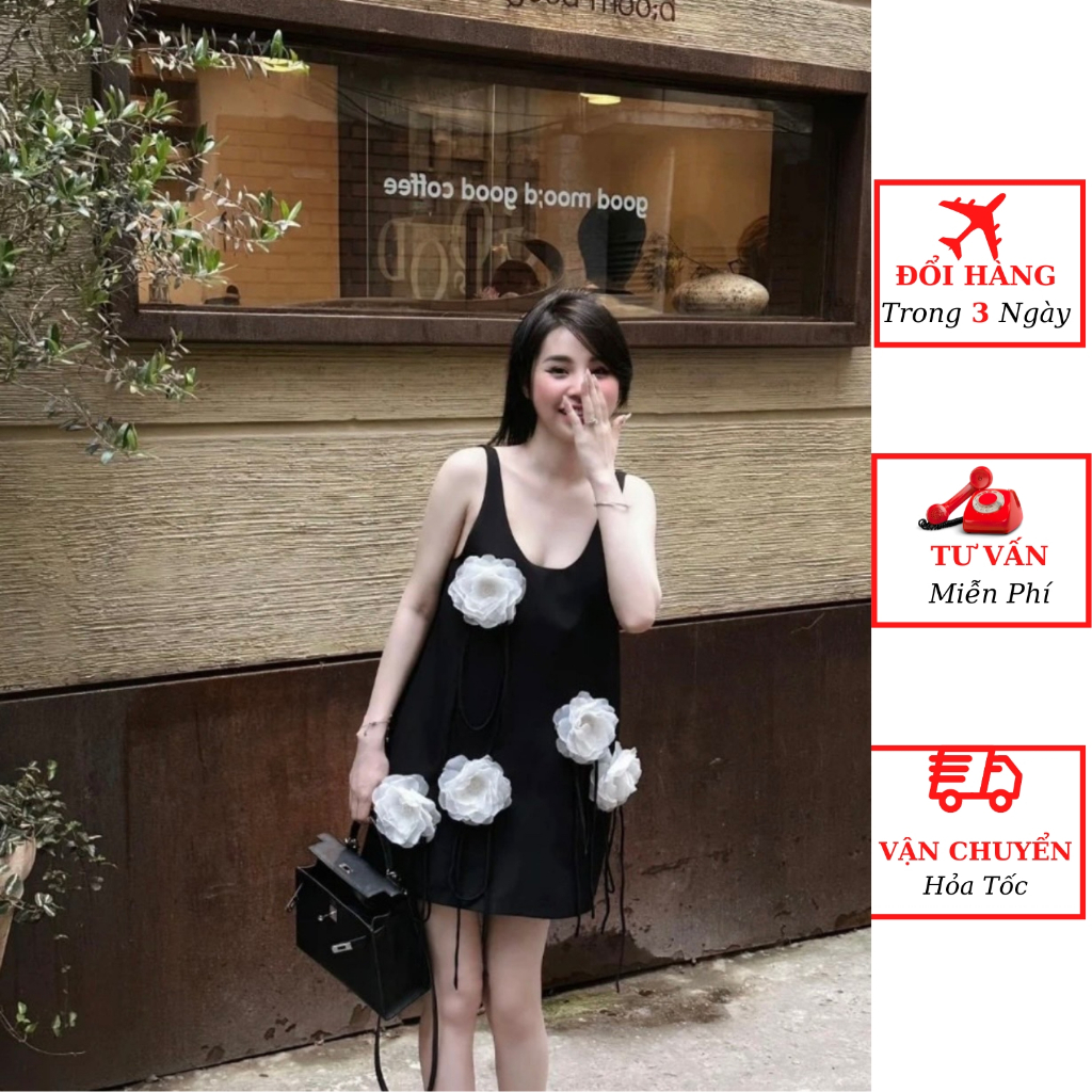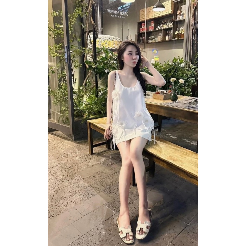 Váy 2 dây suông nữ đính hoa trà nổi sát nách 3 lỗ dáng ngắn tiểu thư bánh bèo đi biển
