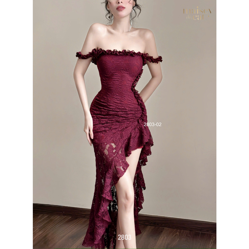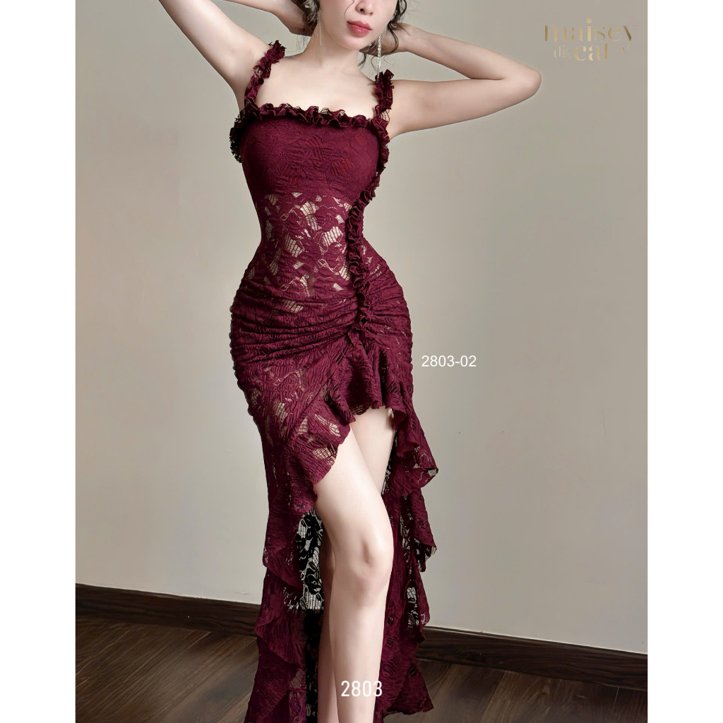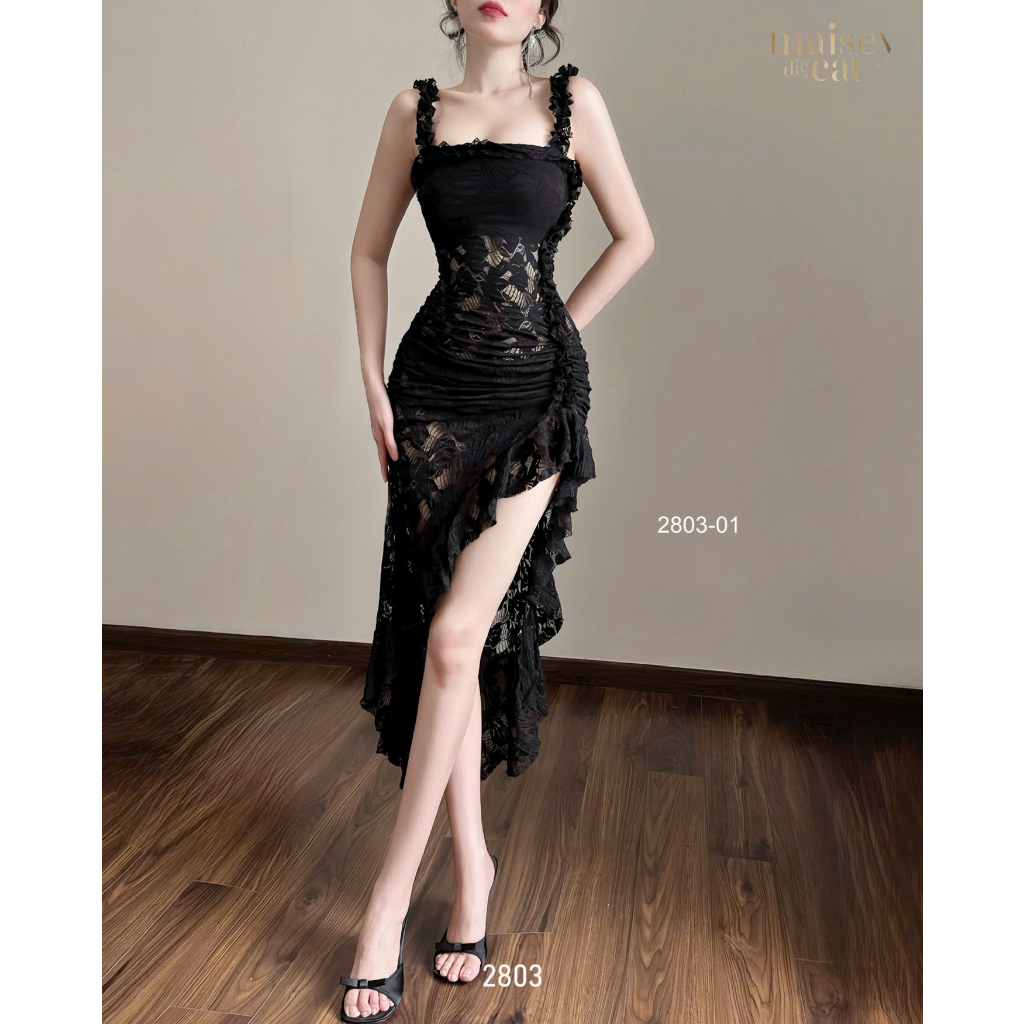 [MAISEY 2803] Set đầm thun ren ôm body phối bèo nhún xẻ tà – Váy dạ hội quyến rũ, sang trọng đi tiệc