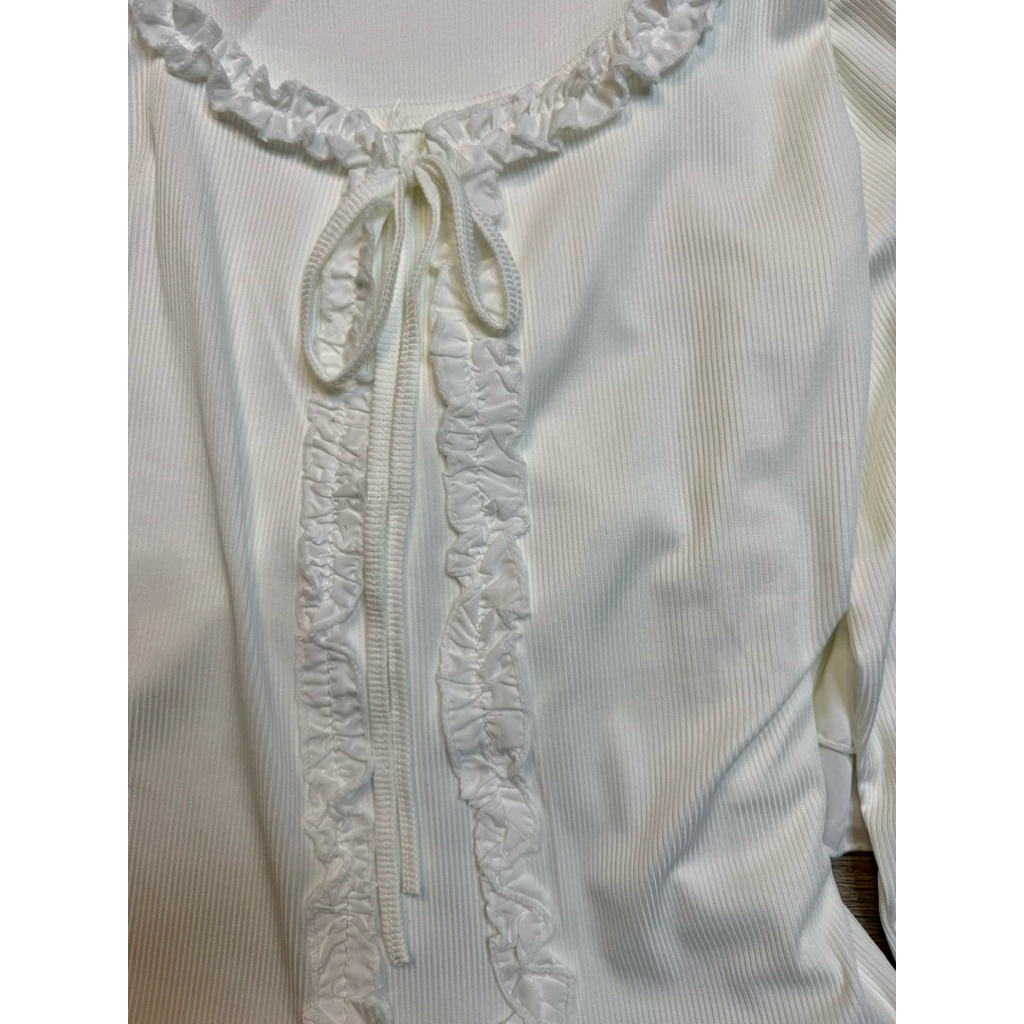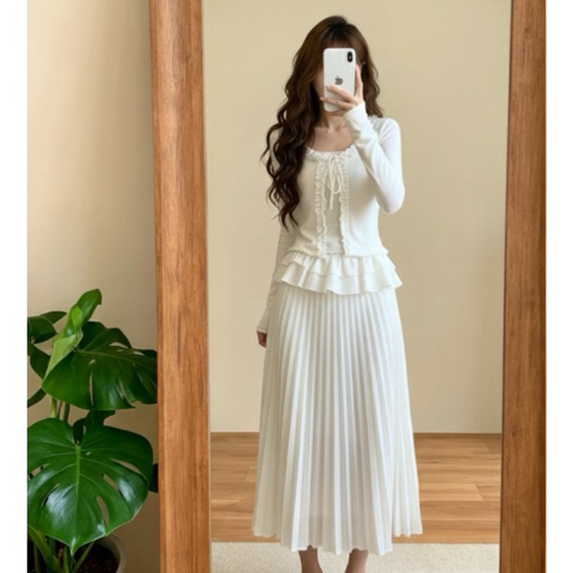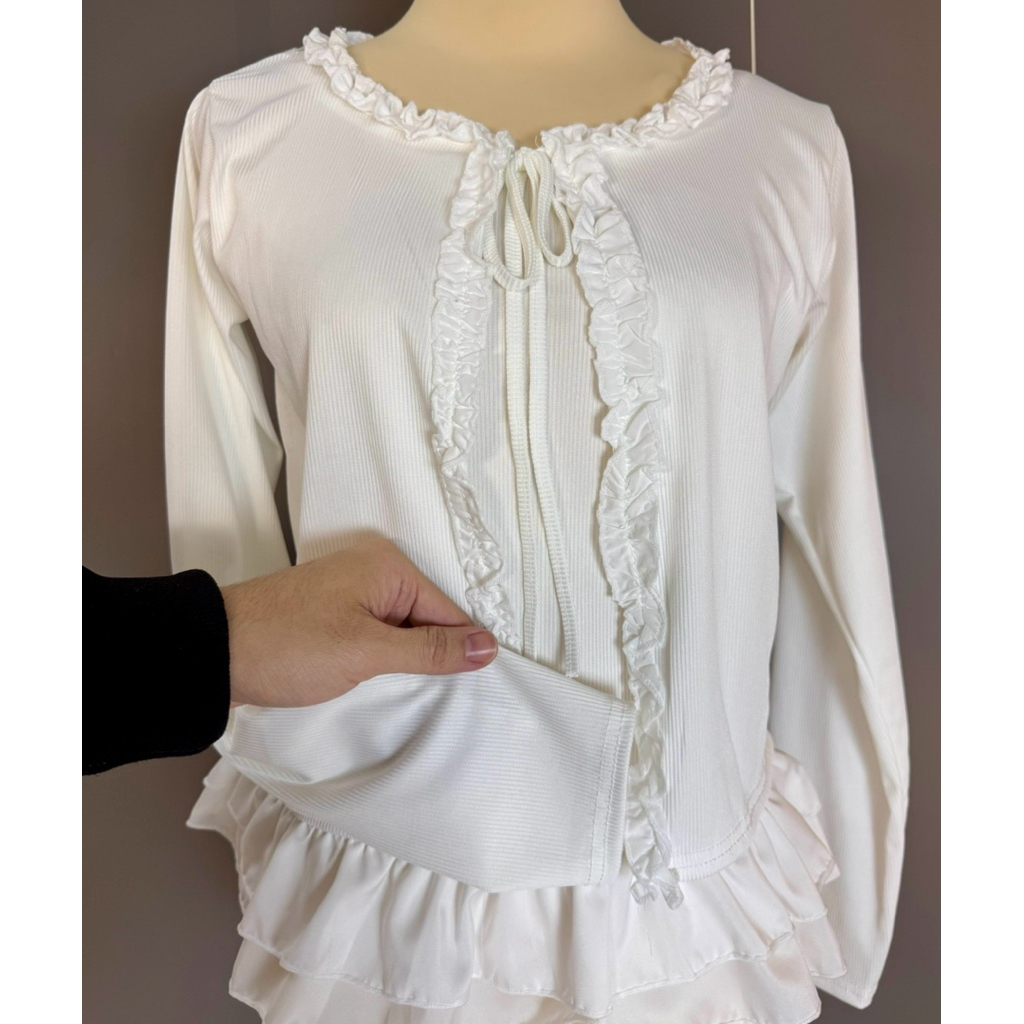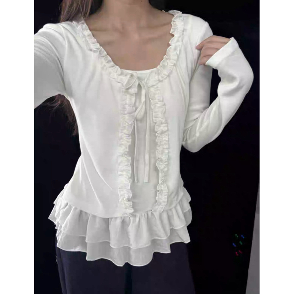 Áo thun dài tay giả hai mảnh viềm ren cột dây nơ, Áo Cardigan thun tăm phong cách dễ thương