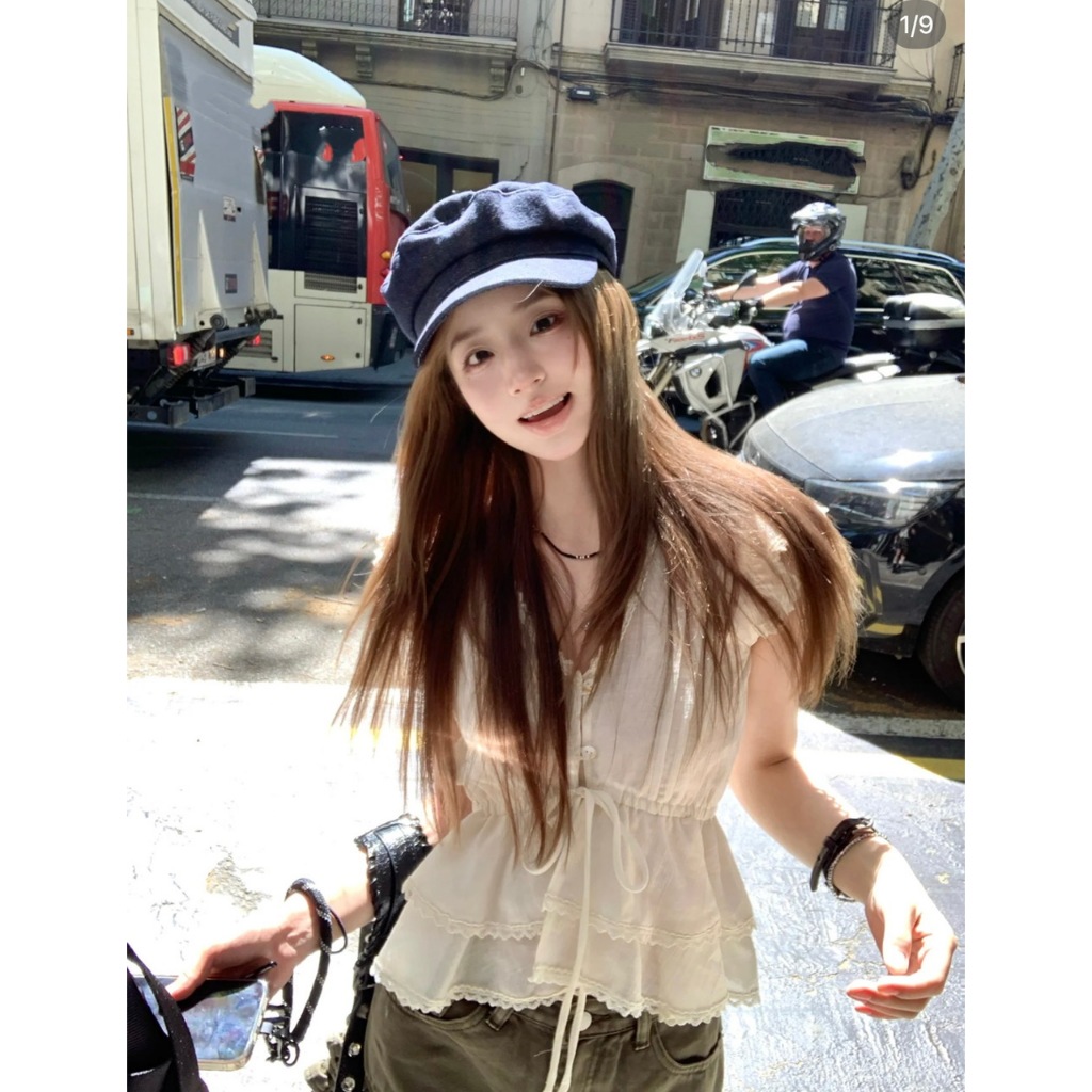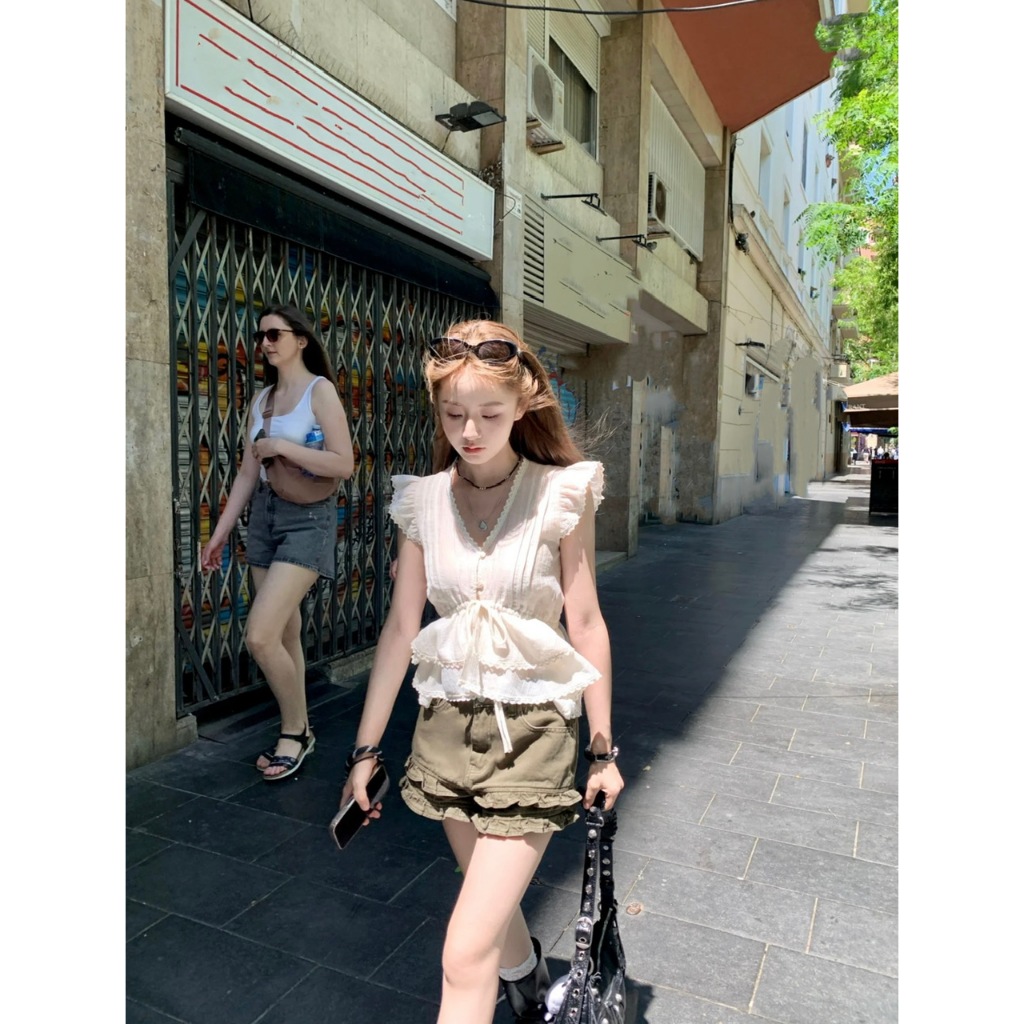 [ĐŨI NHĂN] ÁO SƠ MI KIỂU CỔ V BÈO TẦNG MIX VIỀN REN TAY CÁNH TIÊN RÚT DÂY NƠ NGỰC - DÀNH CHO NỮ
