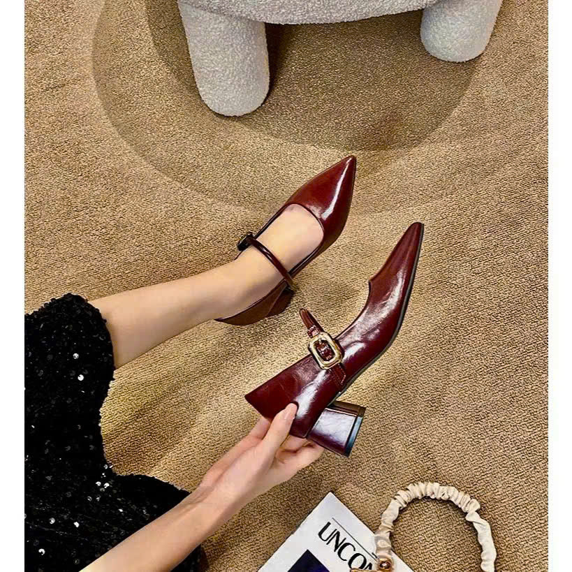 Giày Cao Gót Mũi Nhọn Đế Vuông 4cm Quai Ngang Phối Khoá Béo Sang Chảnh Hottrend - TG24
