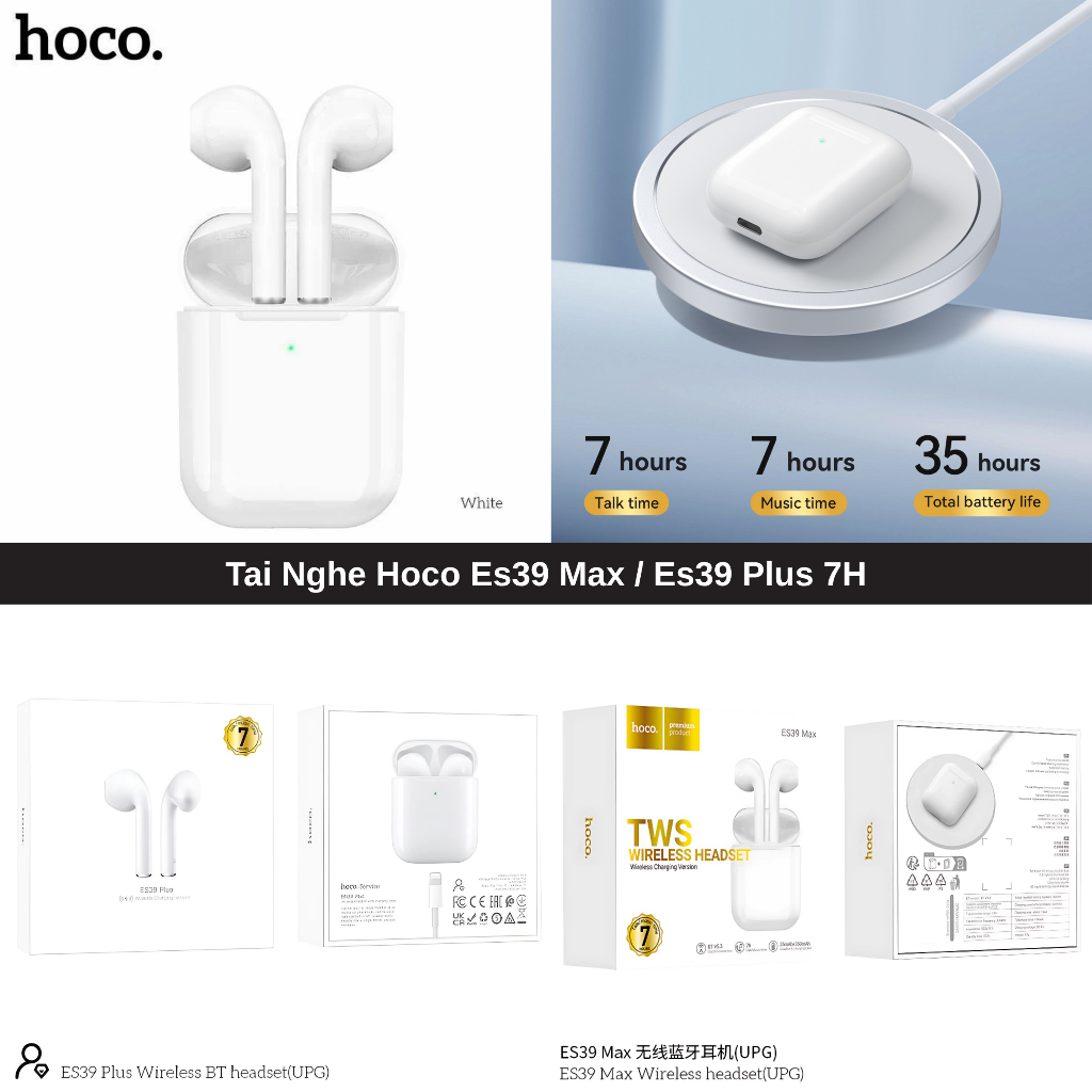 Tai Nghe Bluetooth Hoco ES39/ ES39 Max/ ES39 Plus Hỗ Trợ Sạc Không Dây, Có Mic Đàm Thoại, Nghe Nhạc Liên Tục 4H/7H