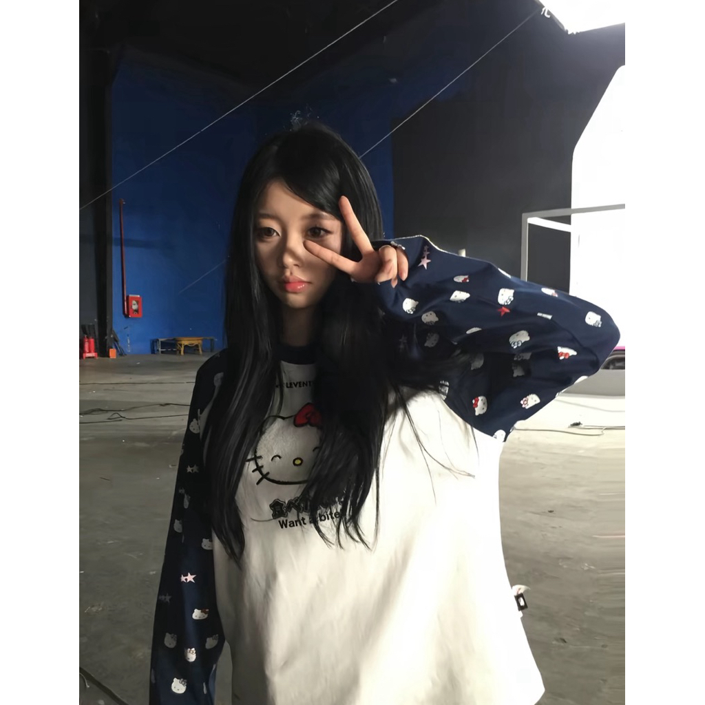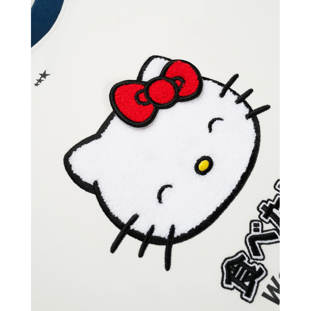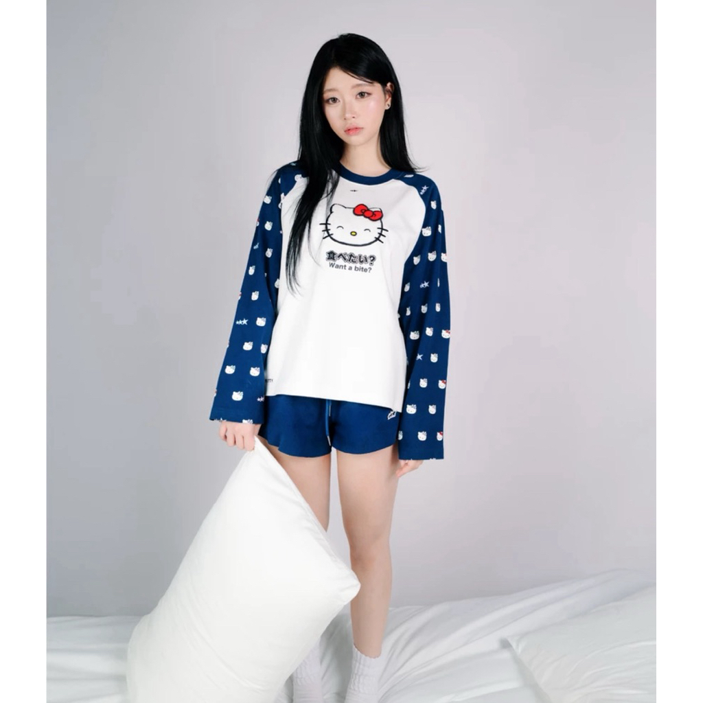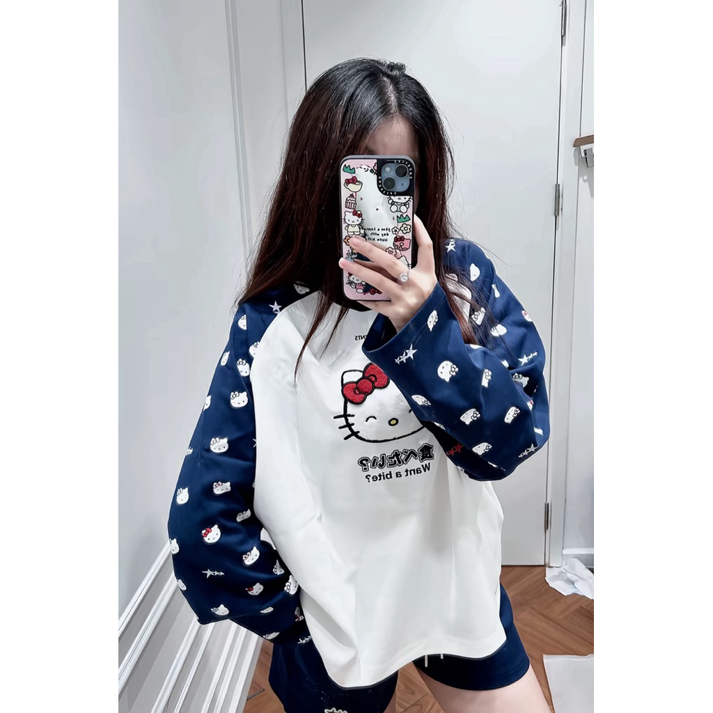 Áo Nhà Lì x Hello Kitty / Raglan Long Sleeve Form Boxy Thêu Xù Màu Trắng Phối Tay Navy (Newtag bọc)