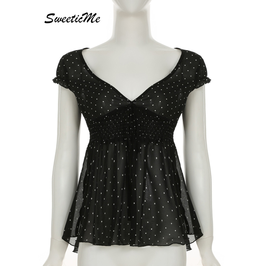 SweeticMe Áo Nữ 2025 Thời Trang Cổ Chữ V Gợi Cảm Áo Thun Chấm Bi Thường Ngày