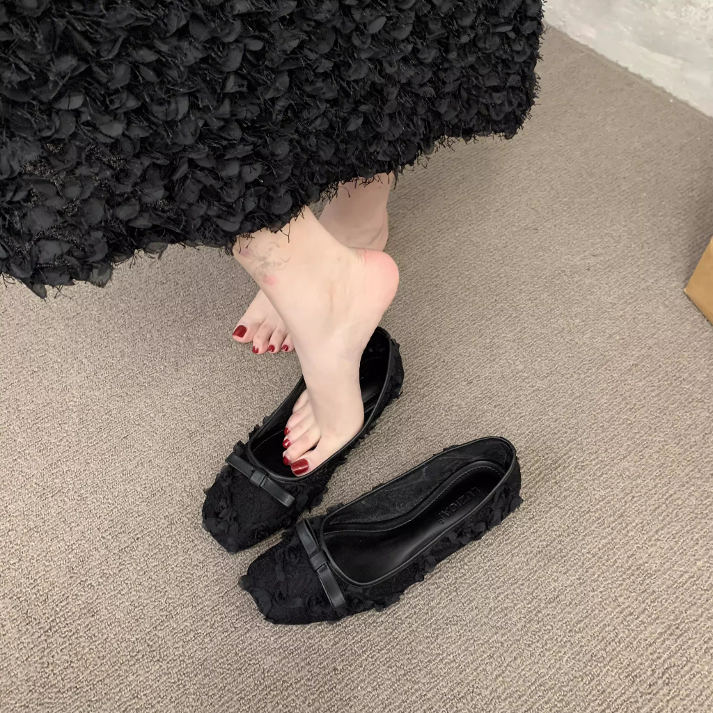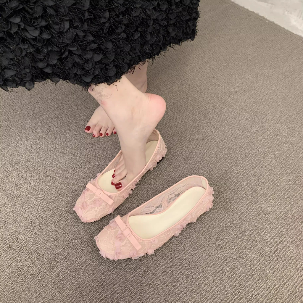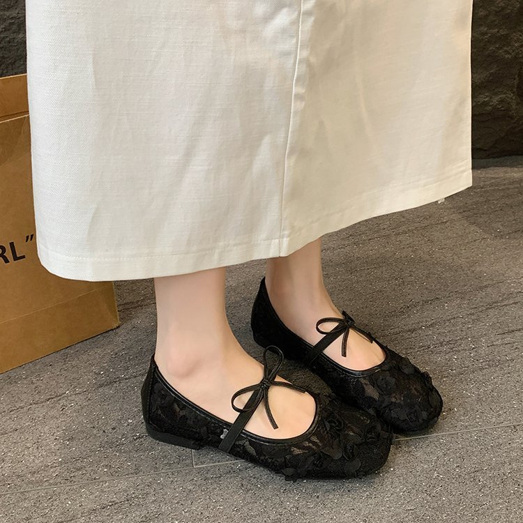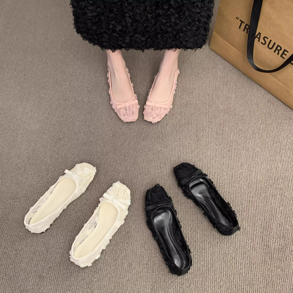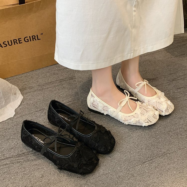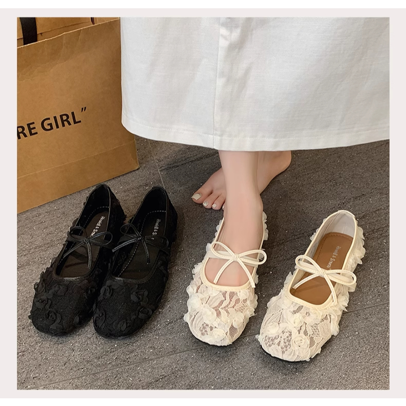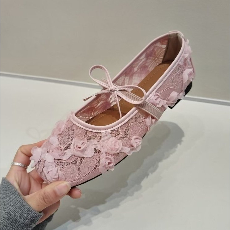 [Lùi 1 size] Giày bệt nữ phối ren hoa hồng quai nơ siêu xinh Mã V037