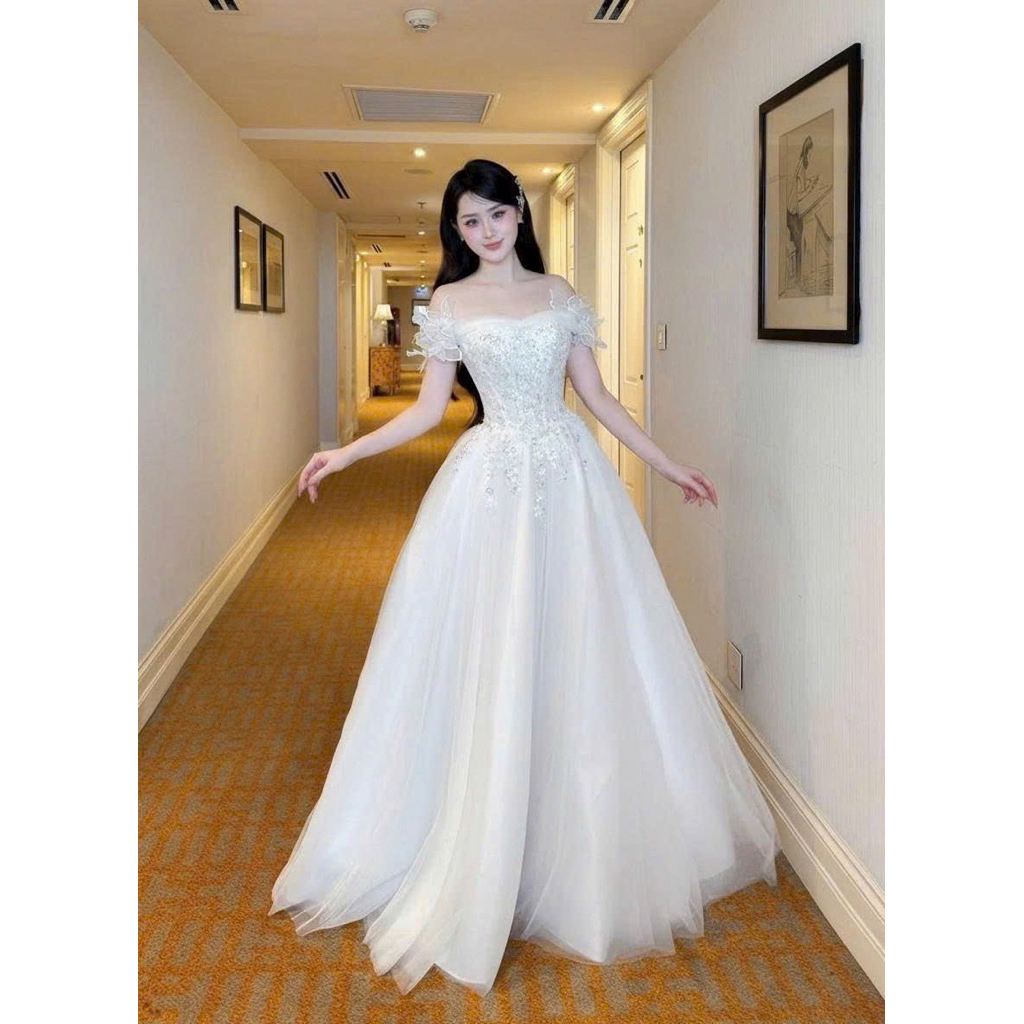 (SẴN KHO ) Đầm maxi cưới TRIPBLE T DRESS trễ vai đính hoa ren cườm - size S/M/L