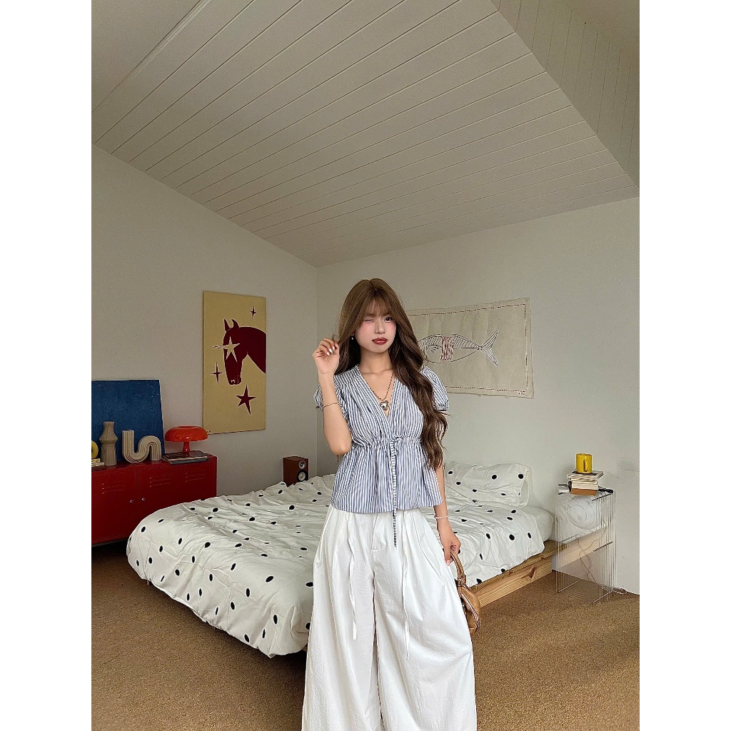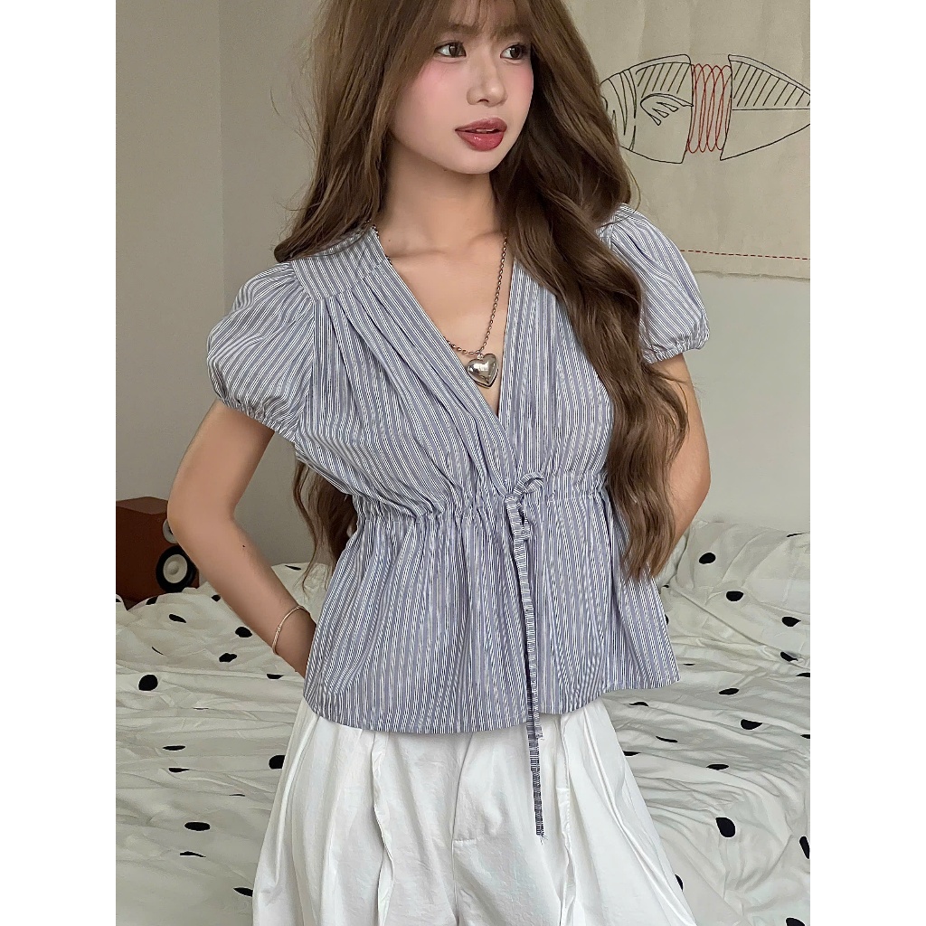 AH25 HANI TOP Áo Kiểu Nữ Xẻ Chữ V Wepretty Áo Xẻ Ngực Kẻ Sọc Dáng Ôm Phong Cách Lịch Sự Sang Trọng