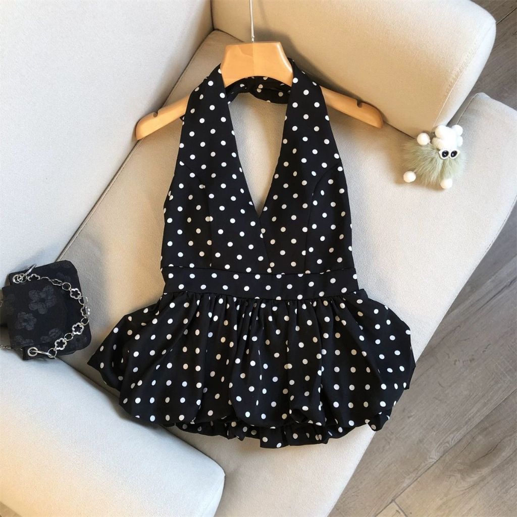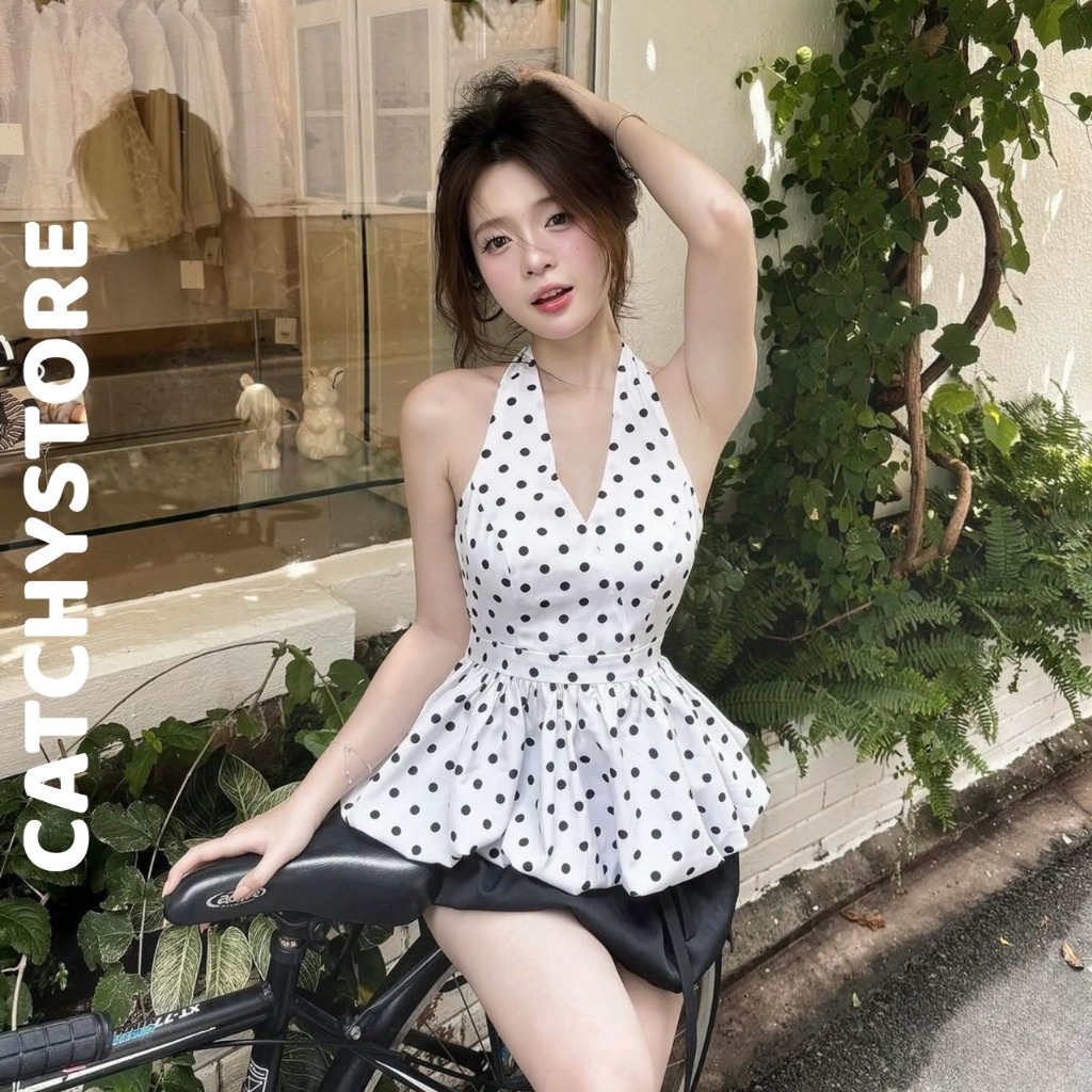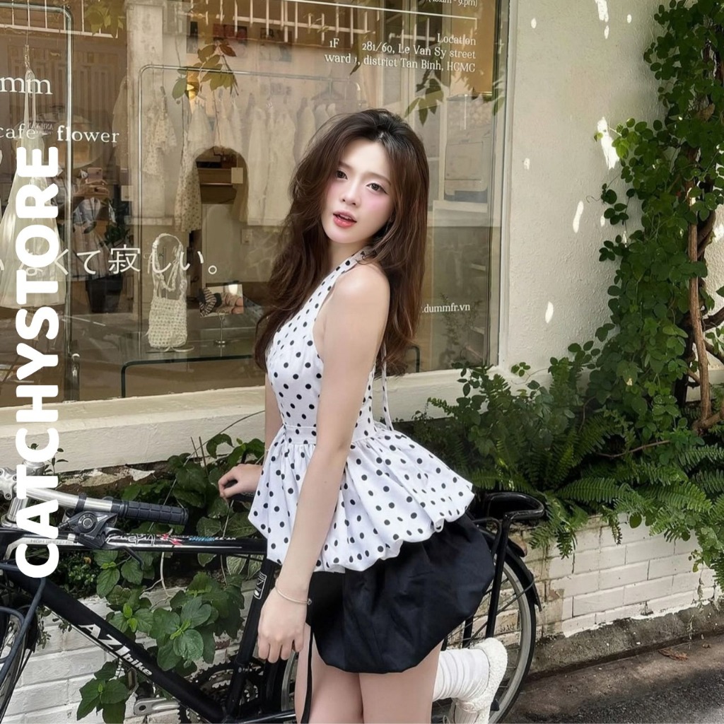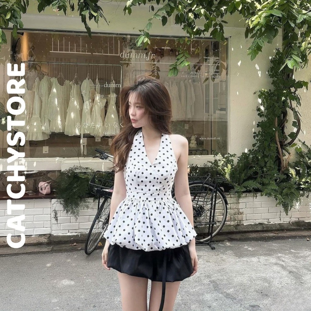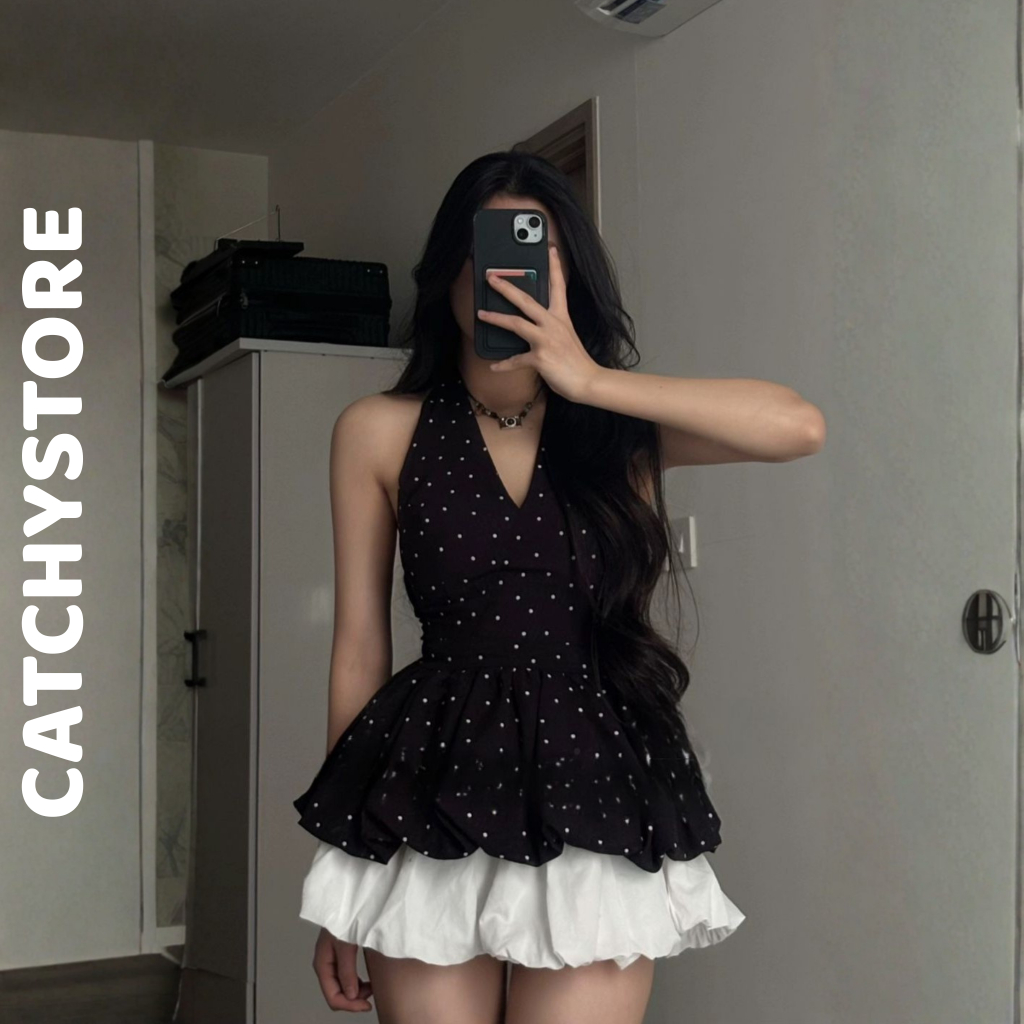 Set áo yếm cột dây form bí chấm bi phối chân váy đen ngắn nữ tính xinh xắn đi chơi dạo phố CATCHYstore