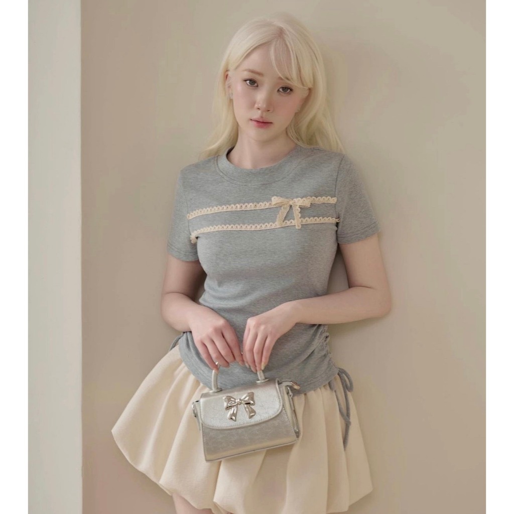 Set áo dệt kim xám phối viền ren nơ thắt eo tôn dáng mix chân váy tùng bí kem có lót CATCHYSTORE
