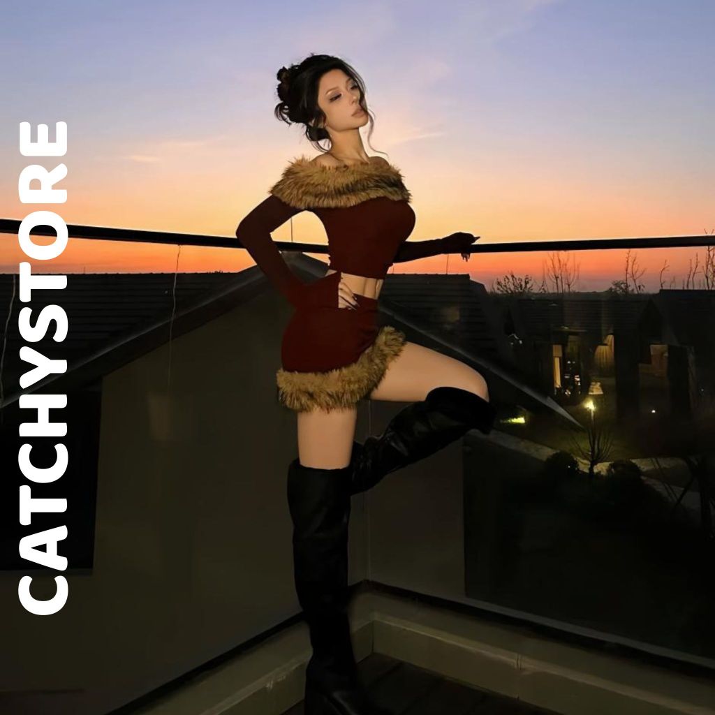 Set áo trễ vai phối lông tay dài kèm chân váy ngắn ôm tôn dáng sang chảnh mùa thu đông đi chơi đi dạo phố CATCHYstore