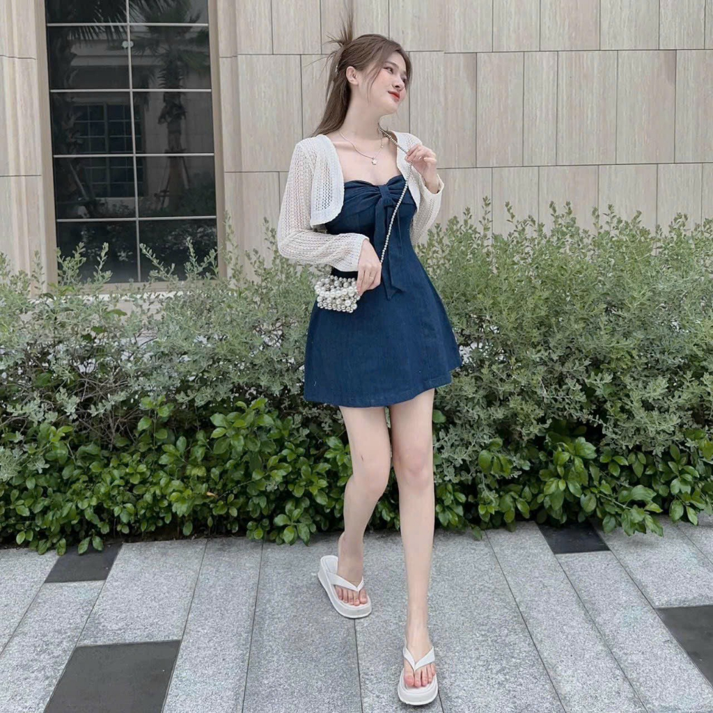 Đầm nữ thời trang mặc đi chơi chất jeans hai dây xoắn ngực thắt nơ váy chữ A mix áo khoác ngắn len ren tay dài cao cấp