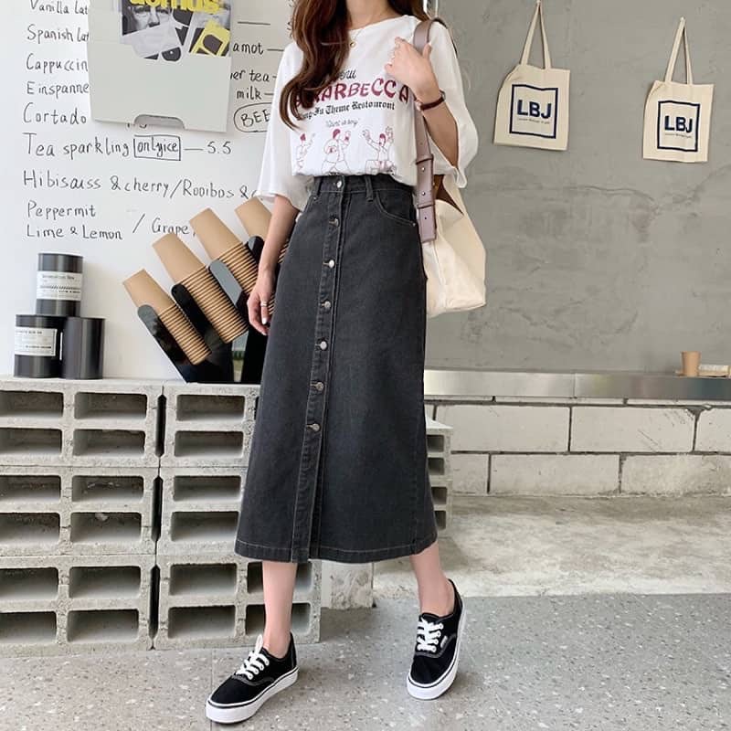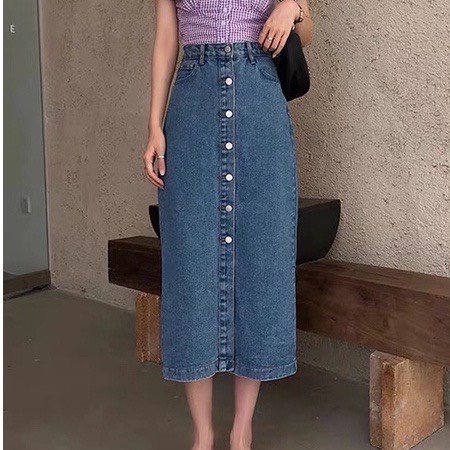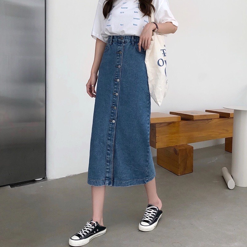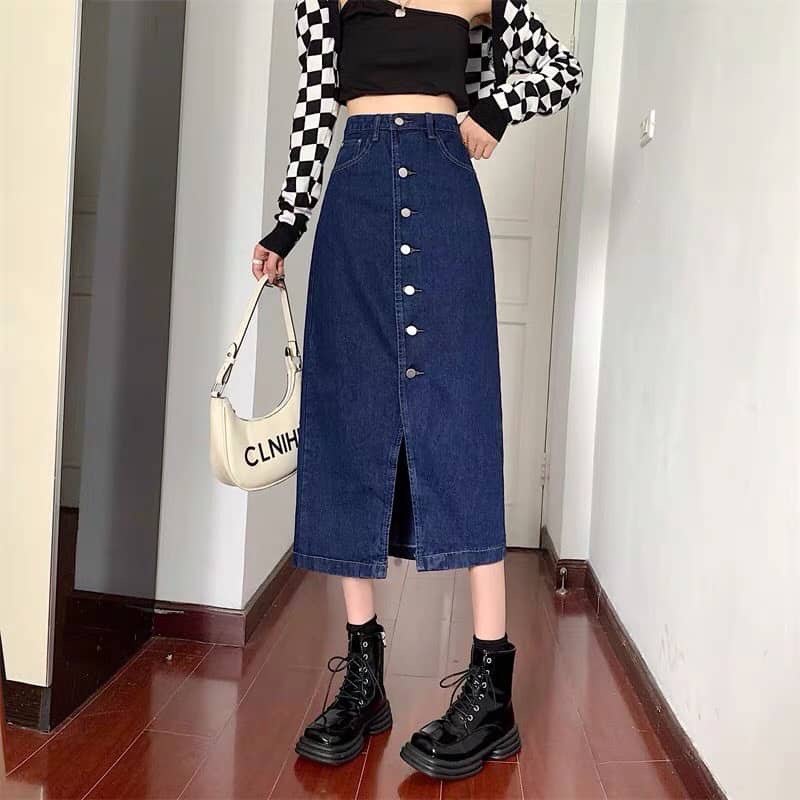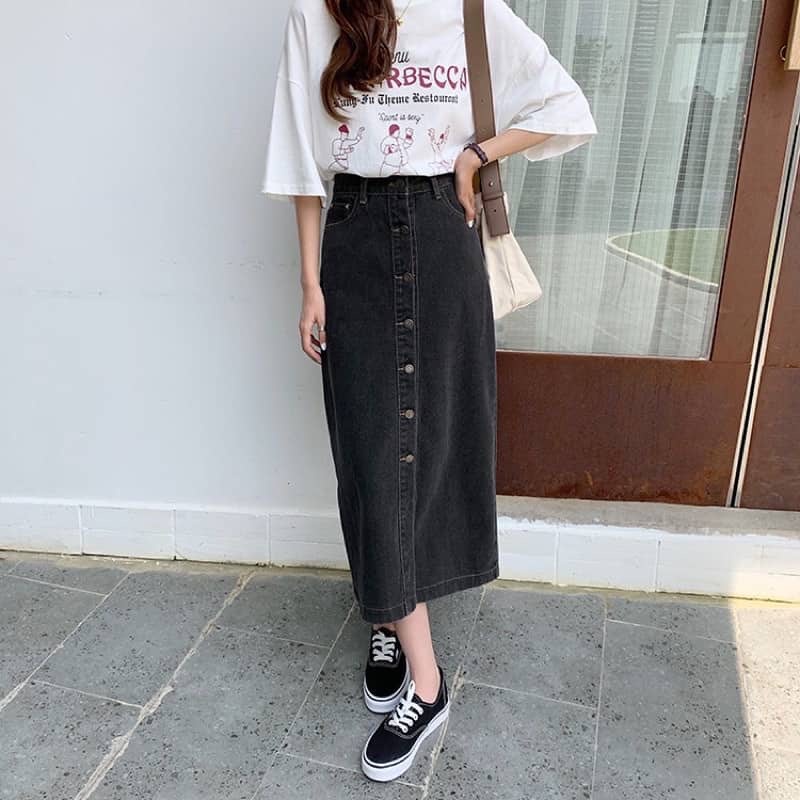 [DEAL HỜI] Chân váy jean dài xẻ tà SARAMIA dáng chữ A cạp cao váy bò midi phối cúc nữ v7