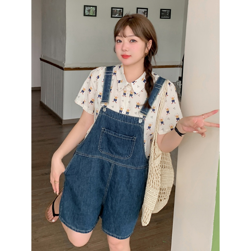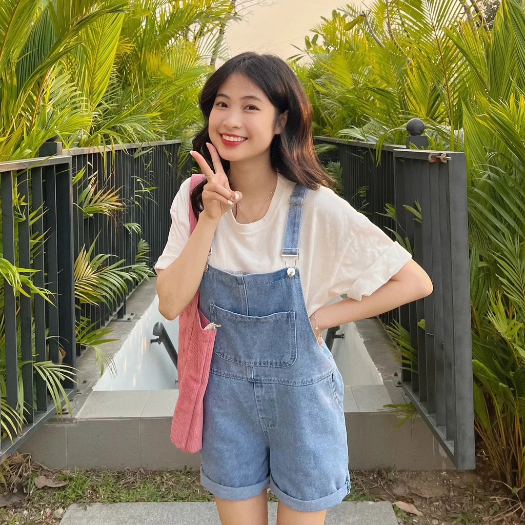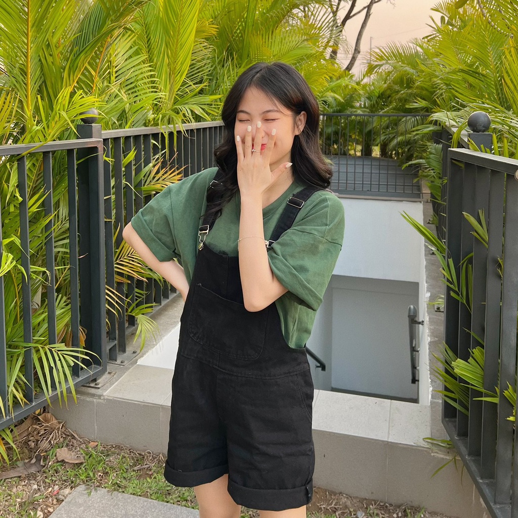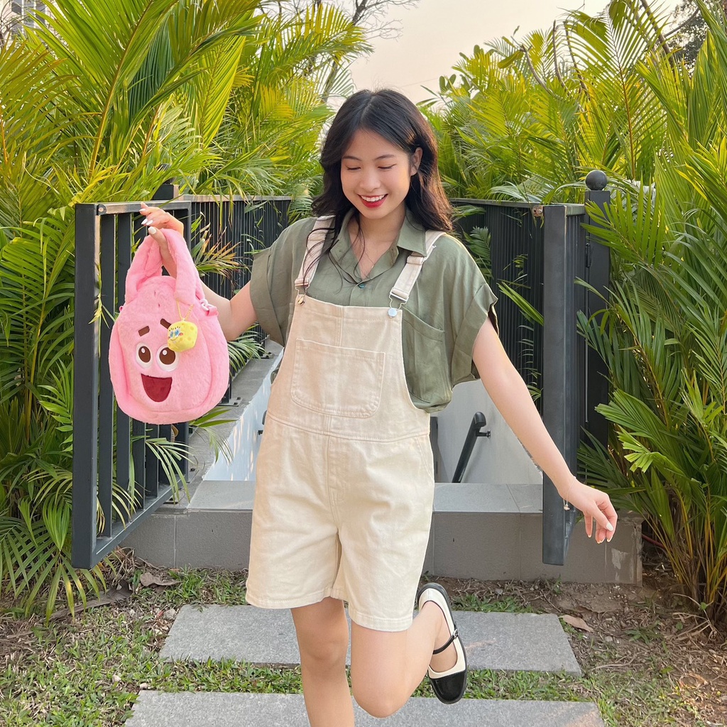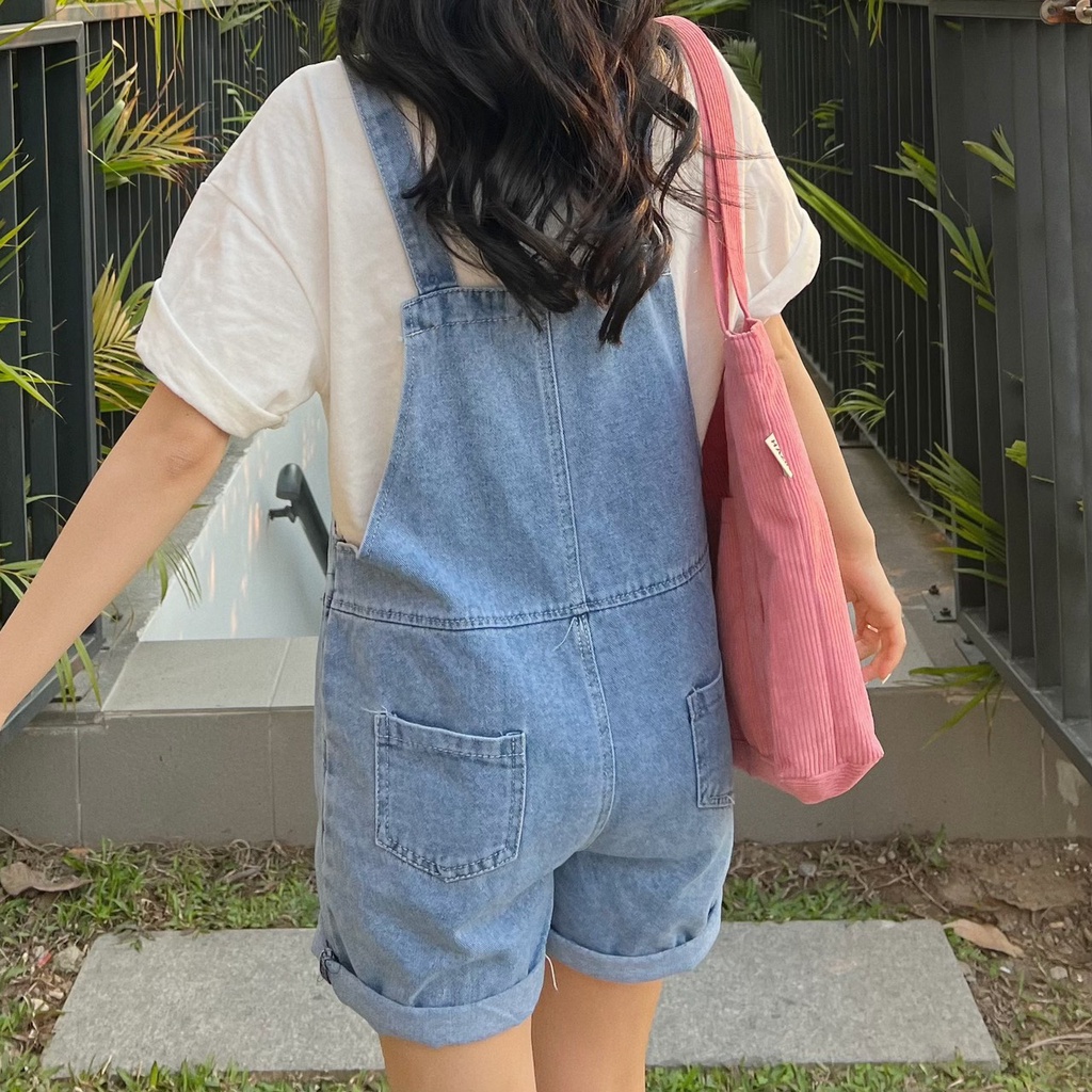 Yếm quần đùi SARAMIA quần yếm jean nữ vải bò liền thân dáng rộng dày dặn phối túi ngực đi chơi Y3