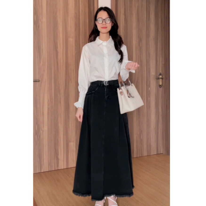 Chân váy bò Saramia váy dài vải jean dáng xòe xếp ly nhẹ che khuyết điểm chân V17