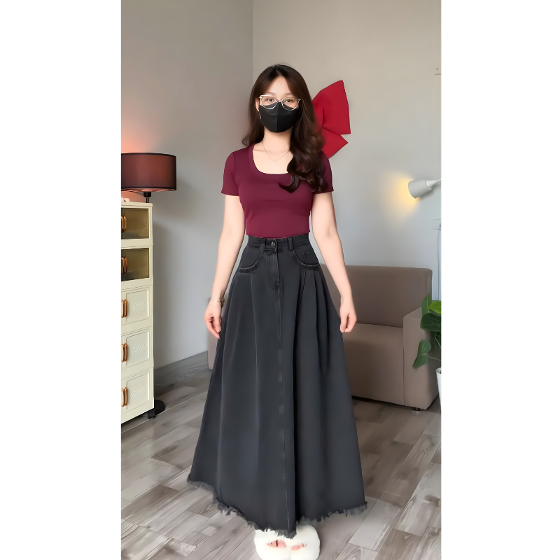 Chân váy jean dài SARAMIA, chân váy dài váy bò chữ A cạp cao xếp ly nhẹ tua gấu V17