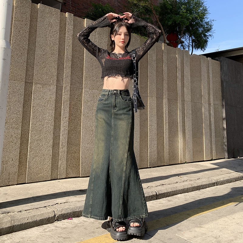 Chân váy jean bò dài đuôi cá SARAMIA chữ A cạp cao dáng xòe vải denim dày dặn V15
