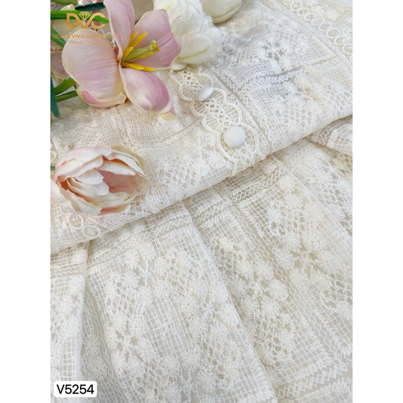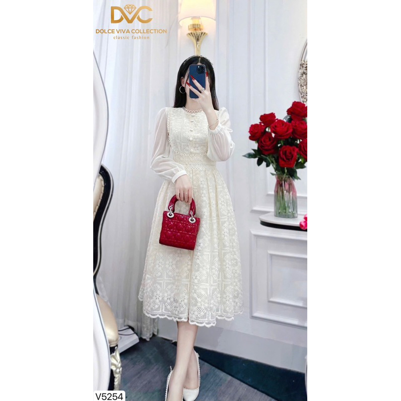 v5254 Váy thiết kế DVC vải ren phối tơ hoạ tiết hoa nổi tay phồng tiểu thư, váy đi tiệc sang chảnh
